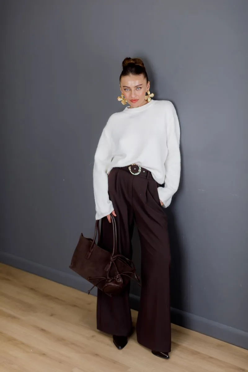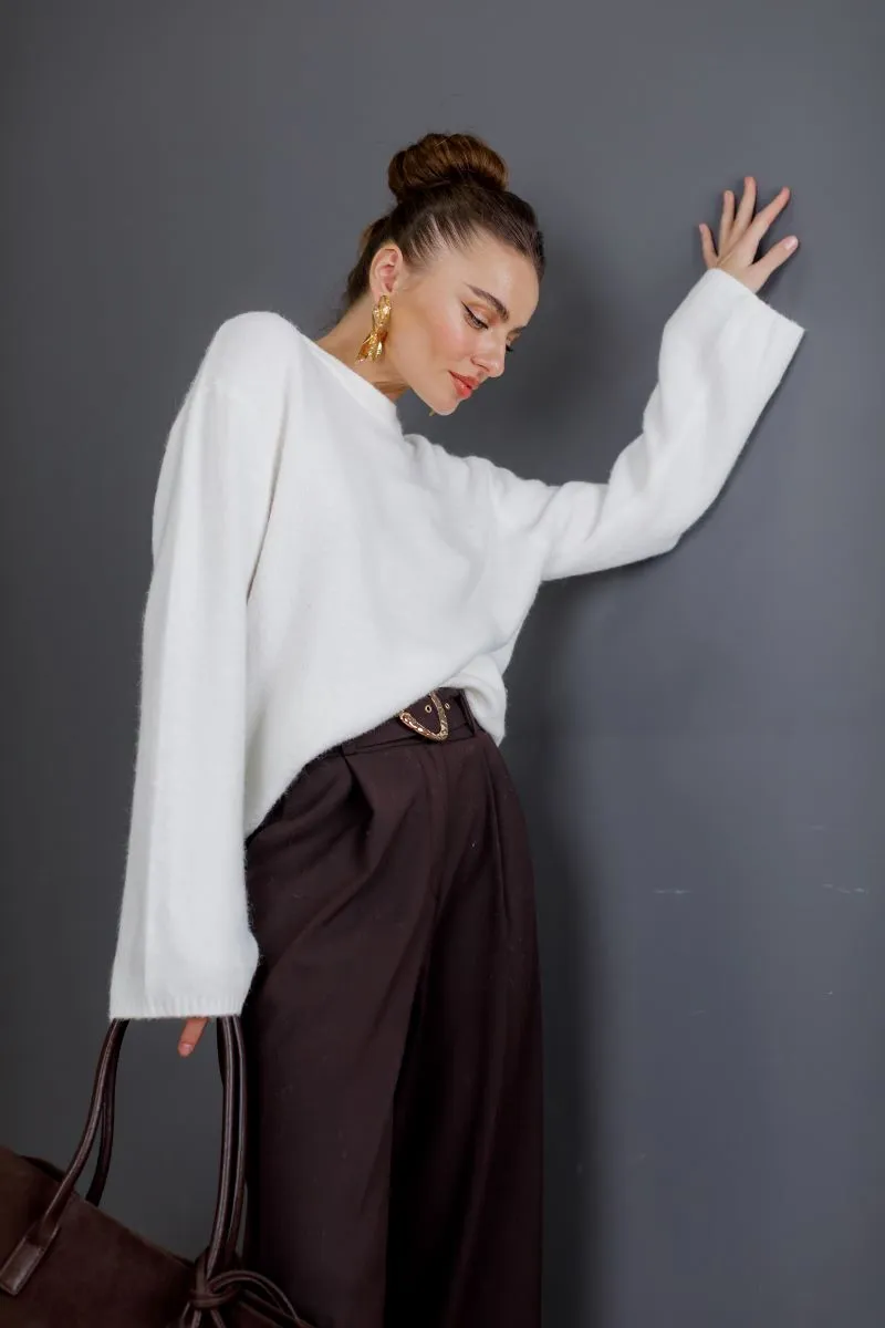 Лаконічний базовий светр молочного кольору — універсальна річ для гардеробу, яка легко поєднується з кожним низом.