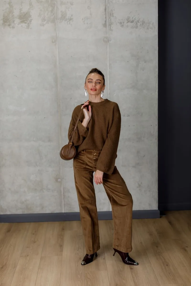 Ідеально поєднується з вельветовими або шкіряними брюками, для створення теплих, осінньо-зимових образів у природній палітрі.
