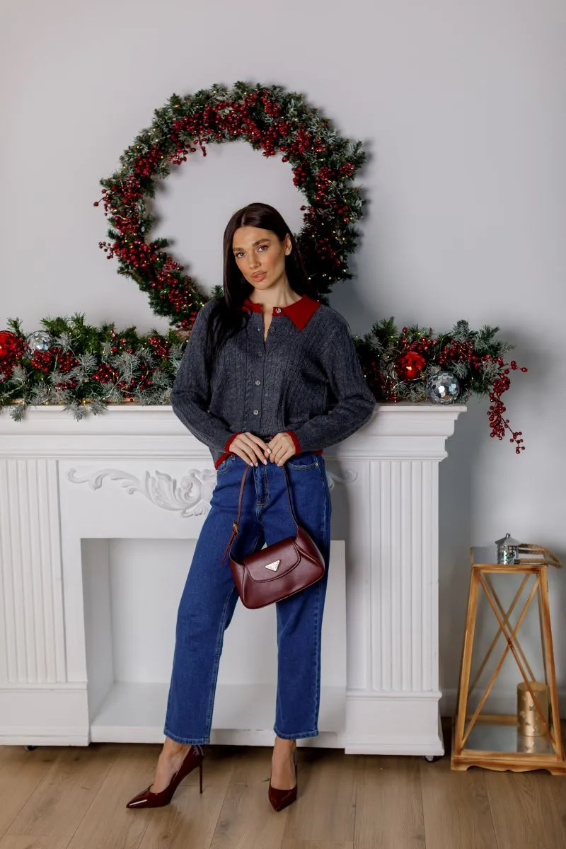 Сірий базовий колір гармонійно поєднується з контрастним коміром і манжетами у бордовому відтінку, створюючи стильний акцент.