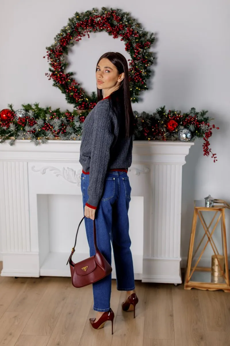Стильний в’язаний светр сірого кольору з акцентним коміром і манжетами