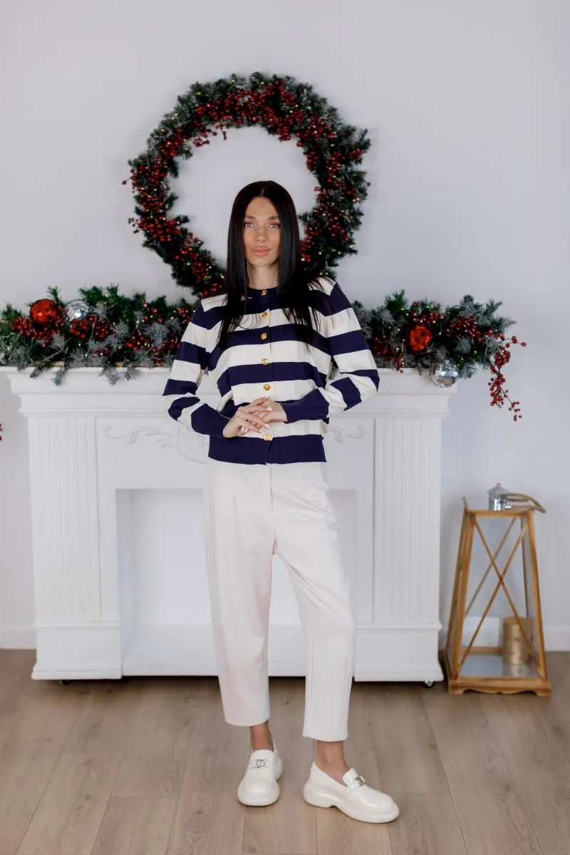 Контрастні горизонтальні смуги створюють динамічний силует, а декоративні золотисті ґудзики додають елегантного акценту.