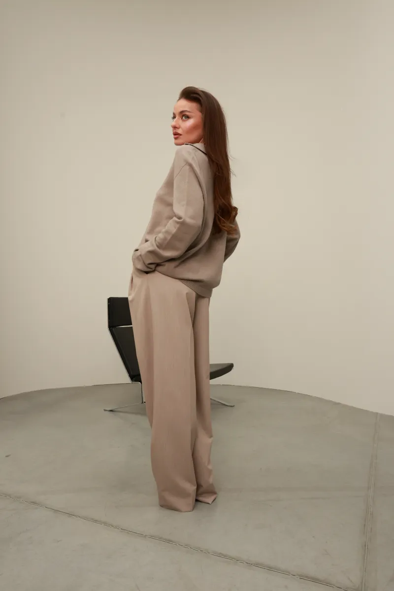 Нейтральний бежево-какао відтінок легко поєднується з брюками, спідницями чи денімом, створюючи універсальні образи у стилі modern chic та effortless elegance.