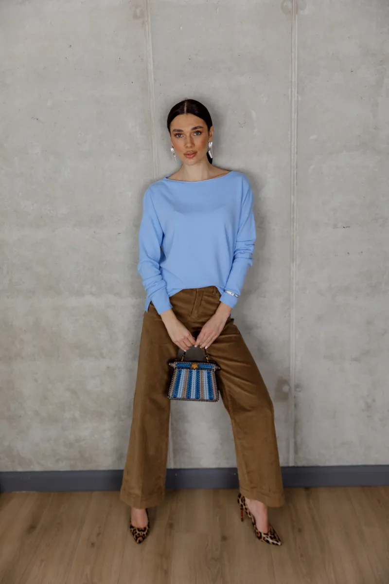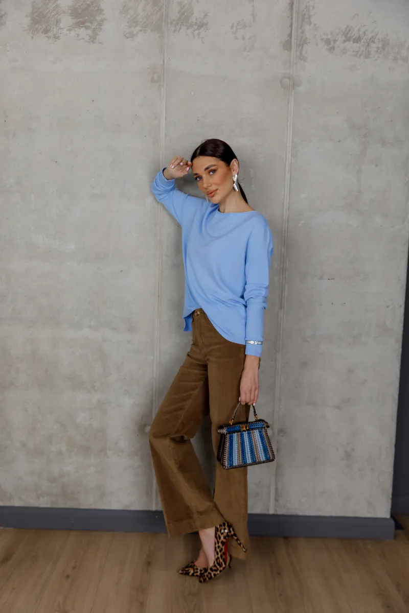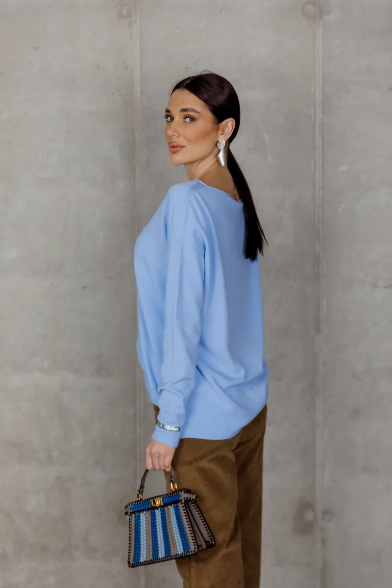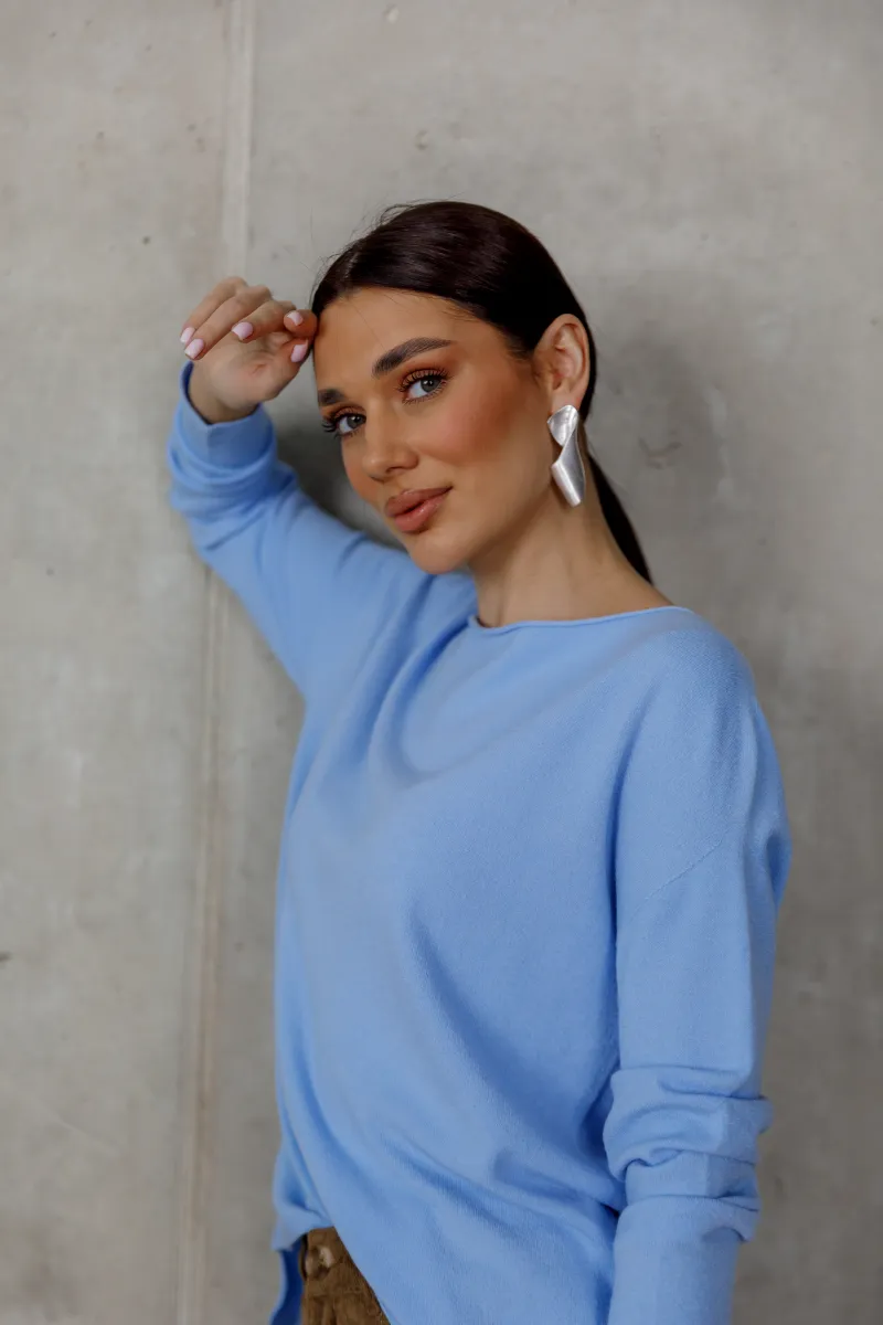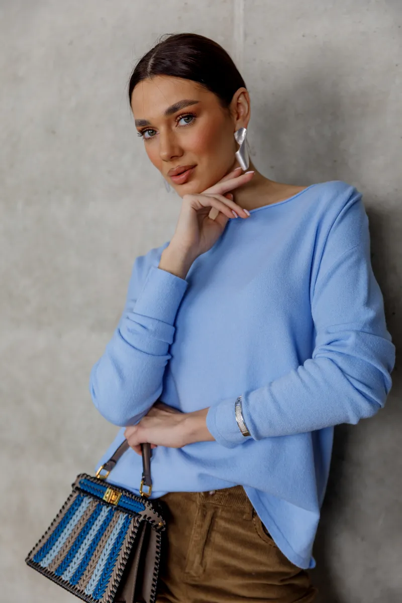 Блакитний светр у чистому, свіжому відтінку створює відчуття легкості та сучасної елегантності.