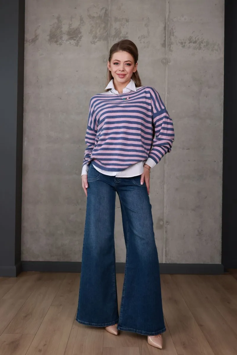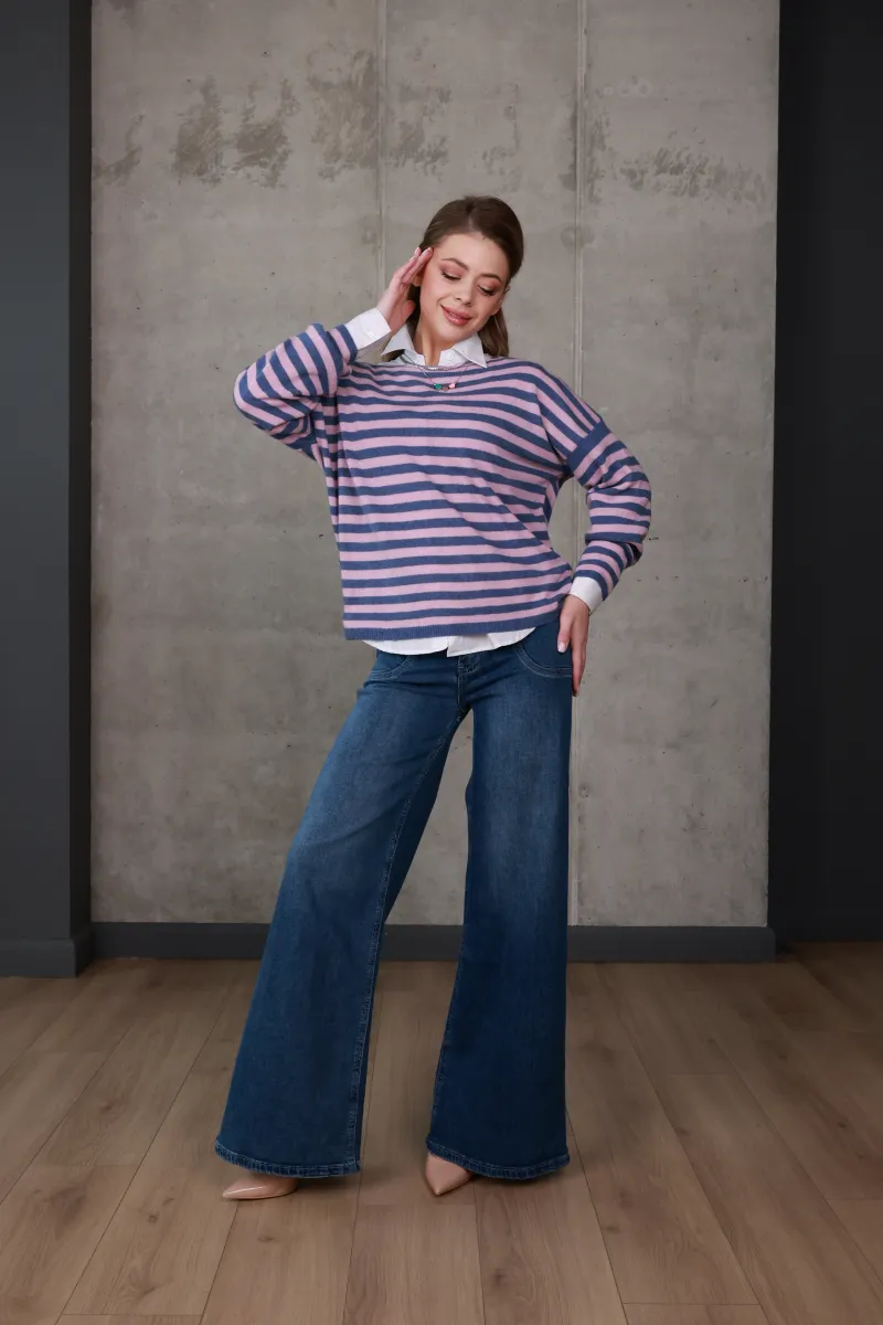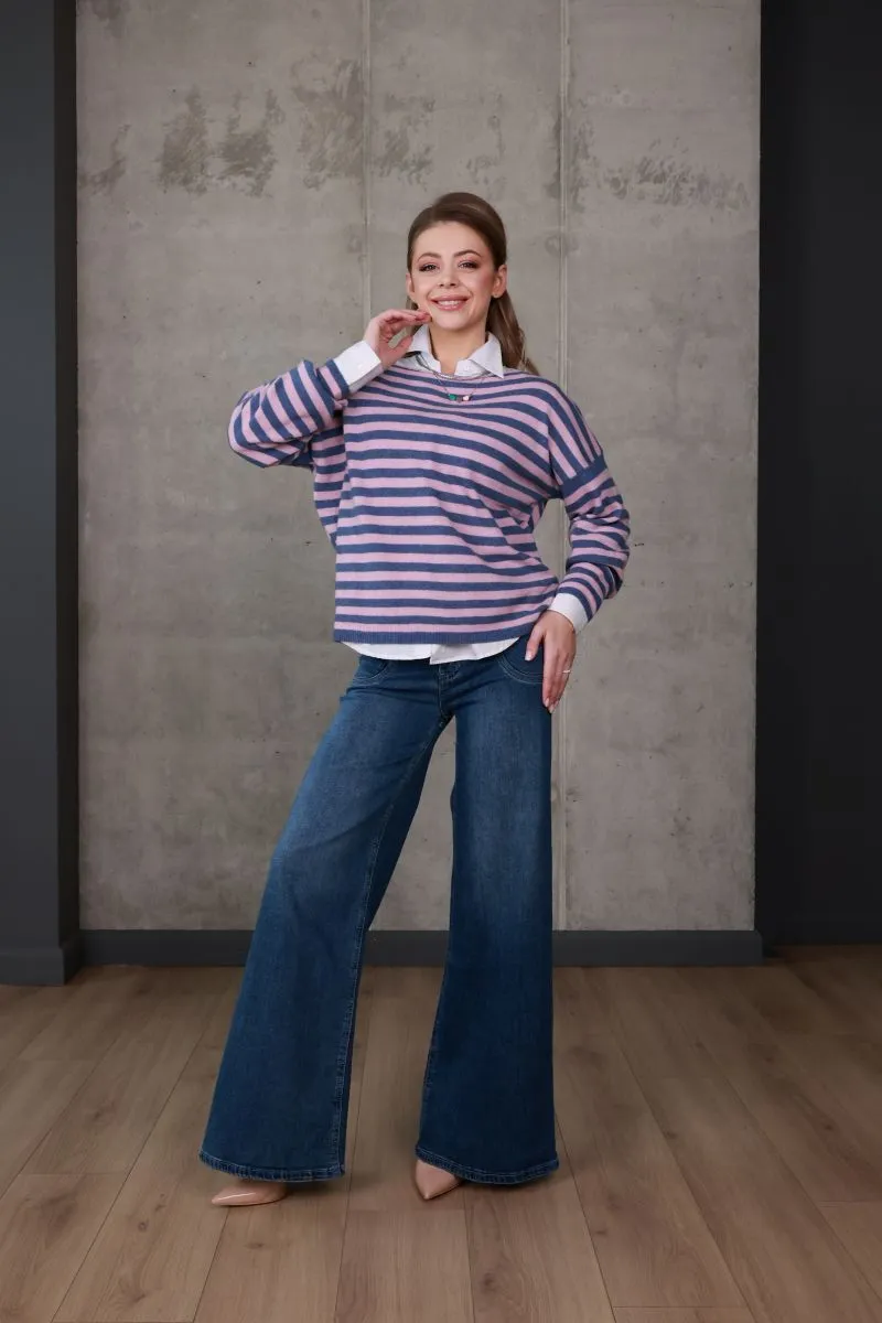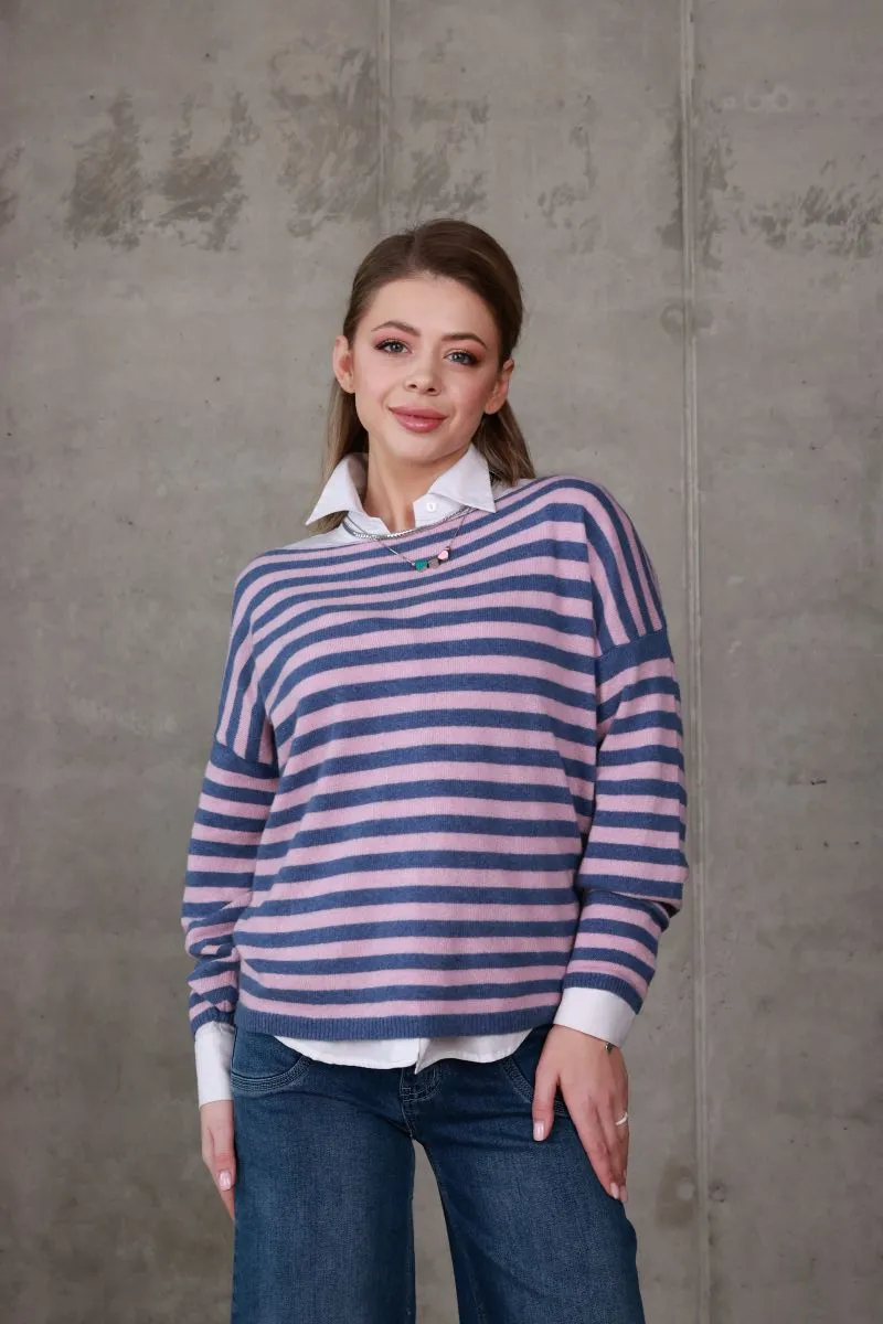 Светр у ніжній рожево-блакитній смужці поєднує комфорт і невимушений стиль.