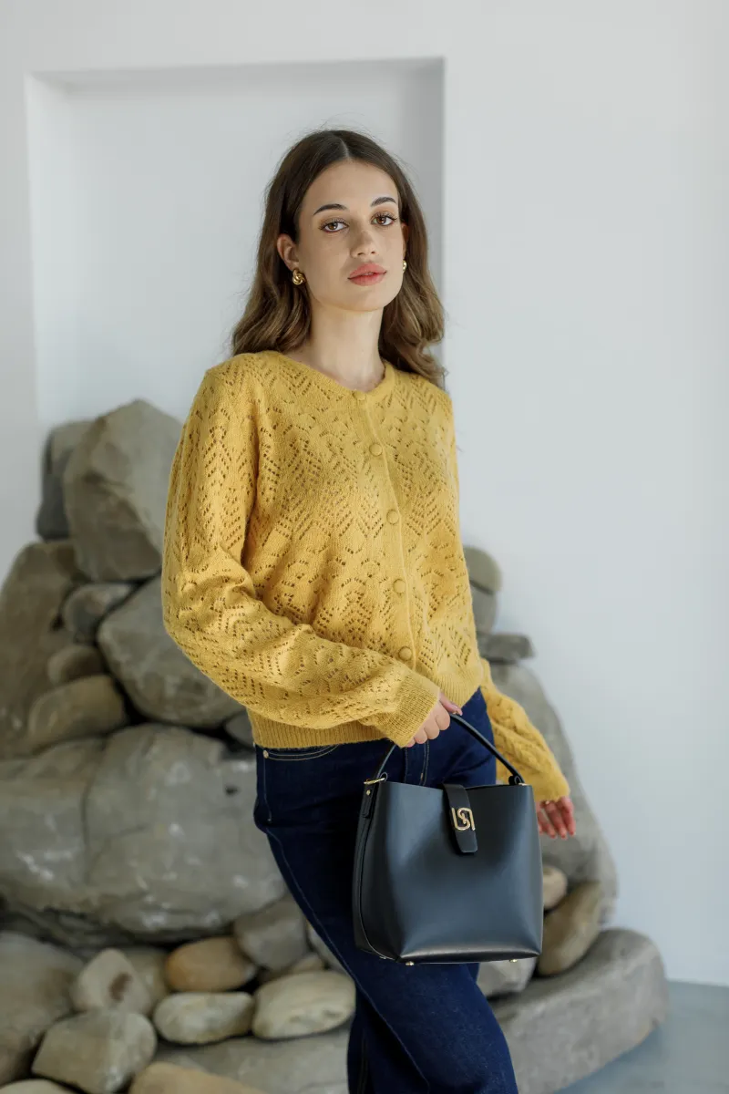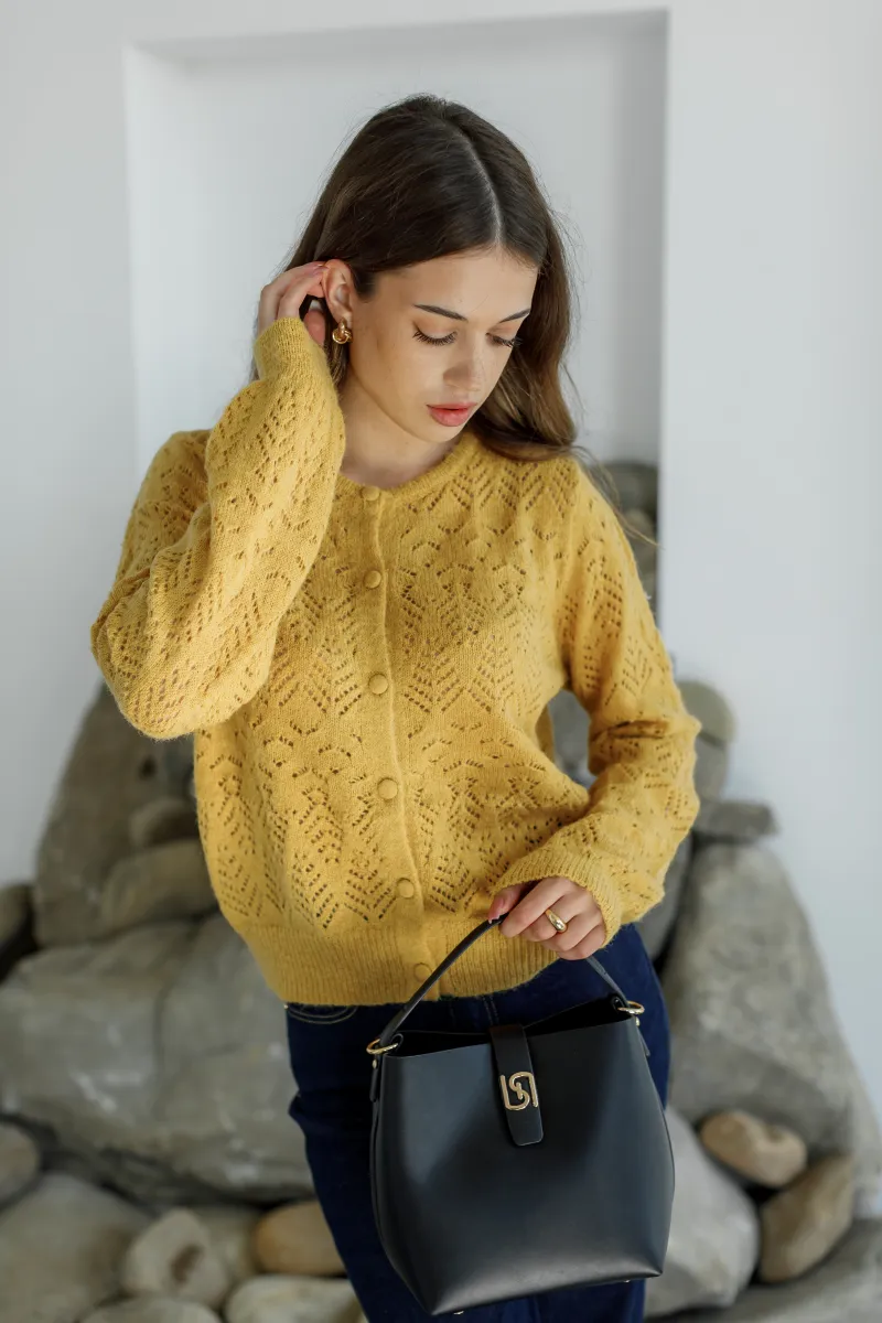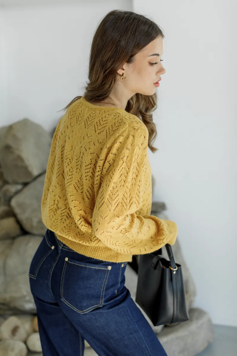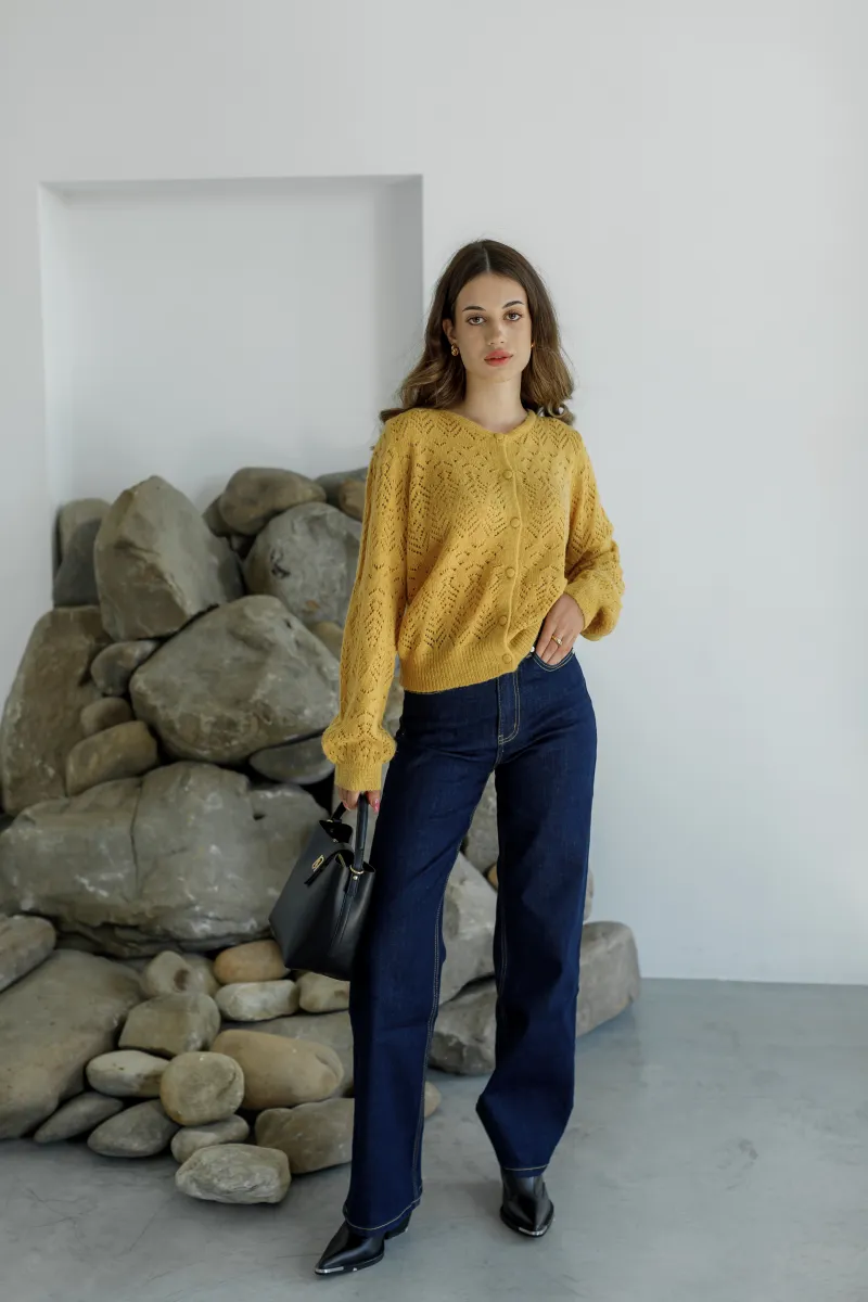 В'язаний жовтий кардиган з ажурним геометричним візерунком, круглим вирізом та ґудзиками в тон