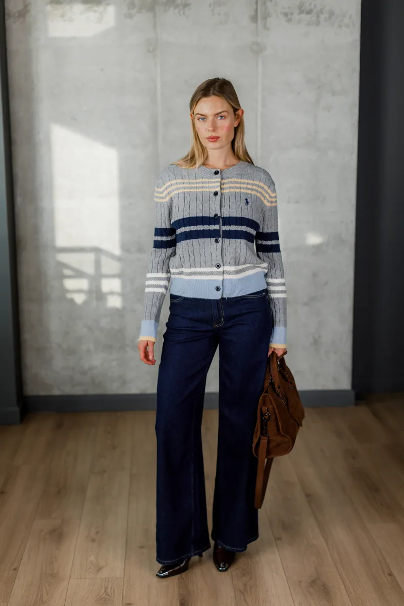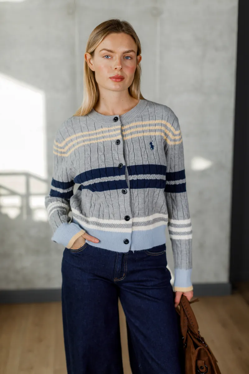 Сучасна інтерпретація класичного в'язаного кардигана з фактурним візерунком «косичка». Витримана сіра палітра в поєднанні з темно-синіми й білими смугами робить виріб елегантним і легко комбінується з базовим гардеробом. Стильний акцент — вишитий логотип бренду на грудях.