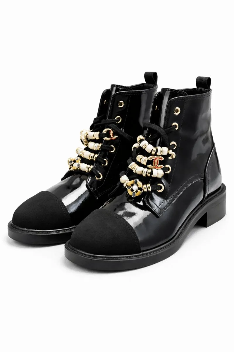 Жіночі черевики виконані з лакованої чорної шкіри та натхненні естетикою Chanel — поєднанням стриманої розкоші, жіночності та чітких форм.