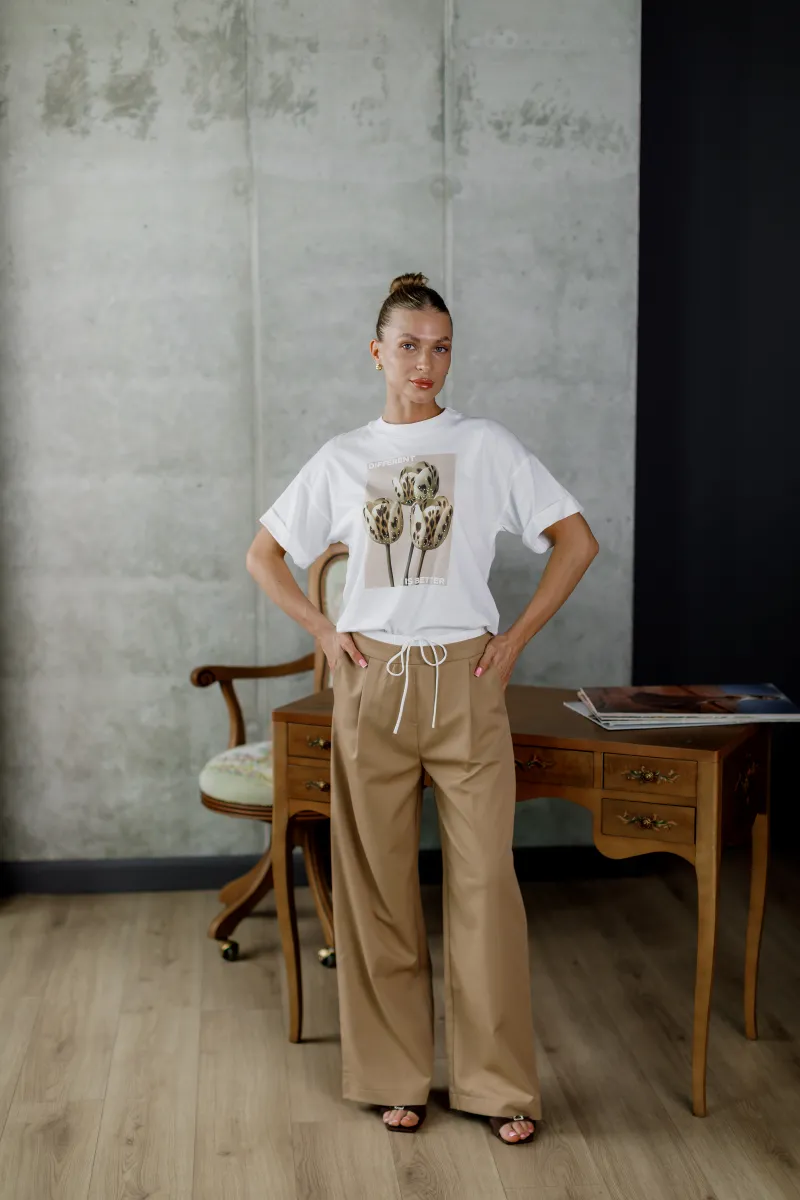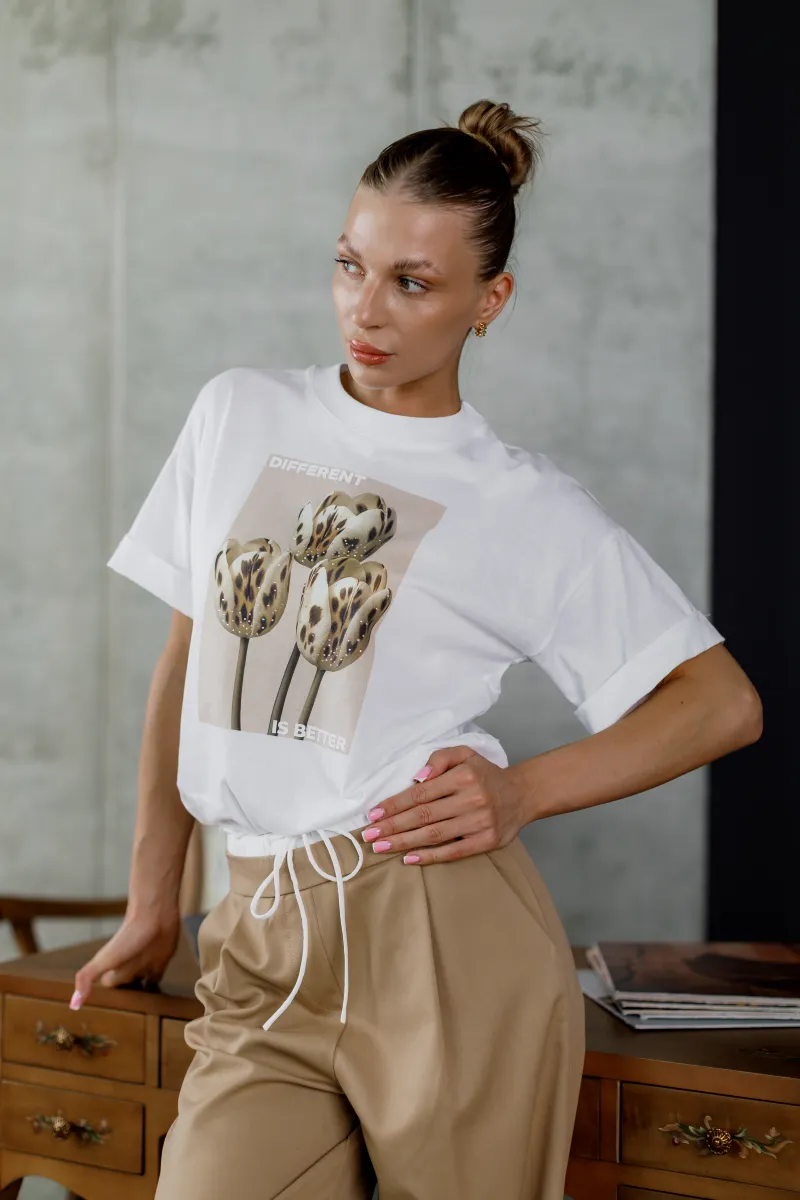 Футболка з лімітованої колекції італійського виробника — це ідеальне поєднання базової класики та арт-дизайну. Модель виконана з преміальної 100% бавовни, що забезпечує комфорт у носінні. Акцент на принті з тюльпанами леопардового забарвлення підкреслює індивідуальність образу та підтримує ідею самовираження. Ідеальна як для денного casual-луку, так і для стильного вечірнього сету з жакетом або брюками.