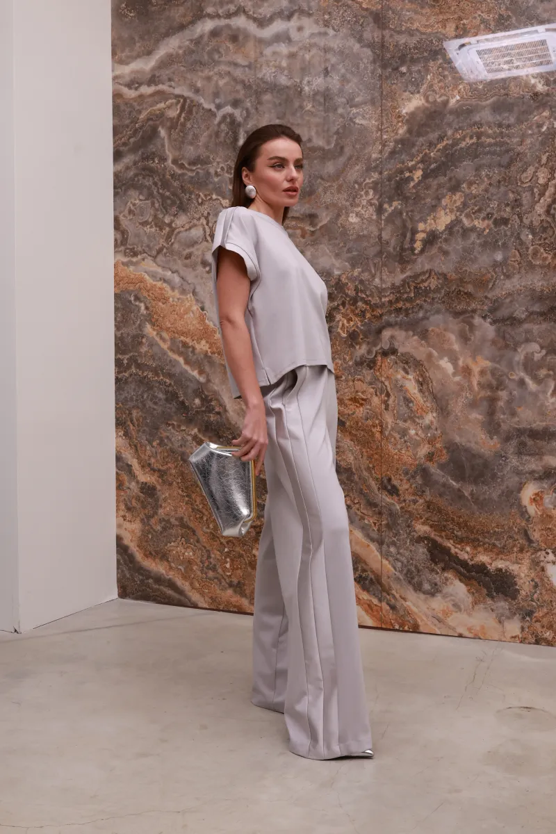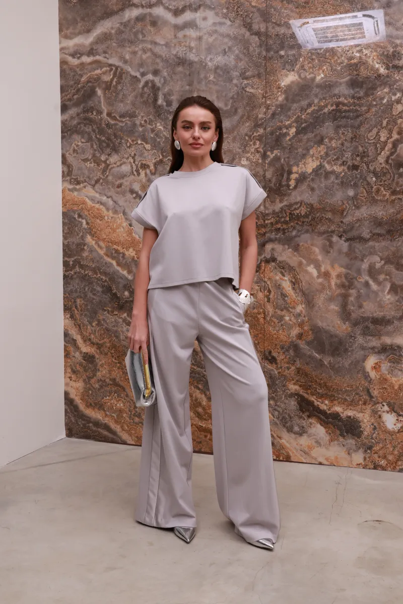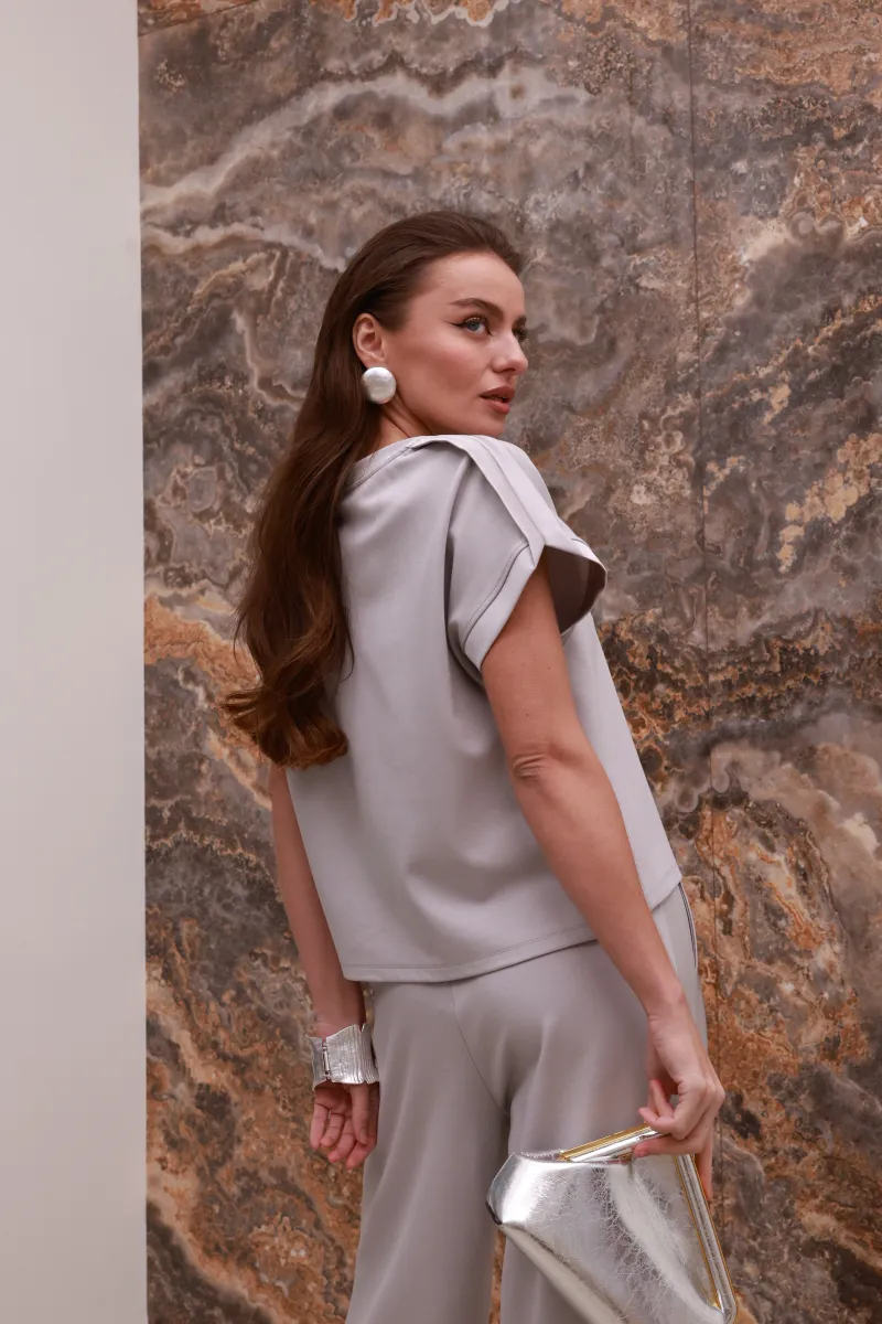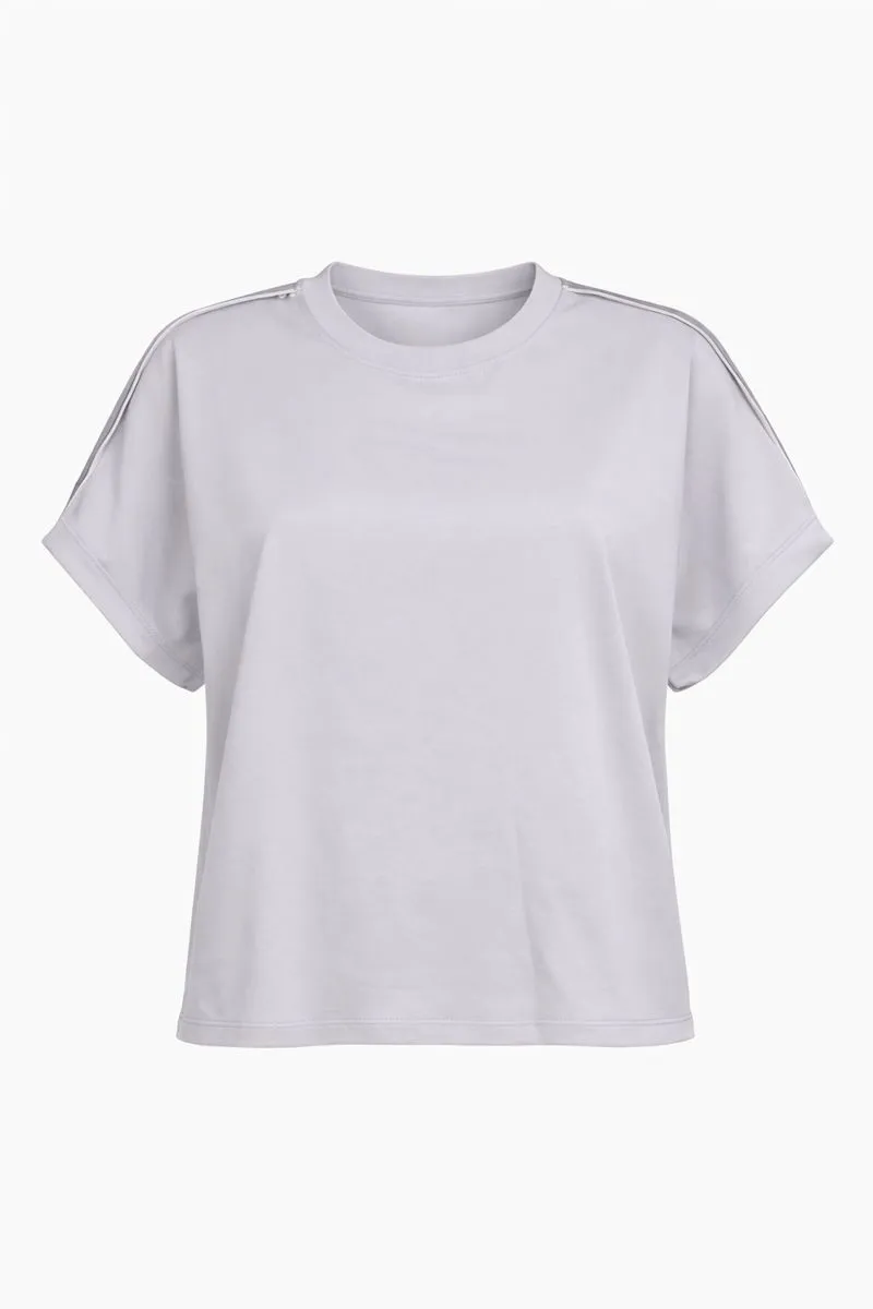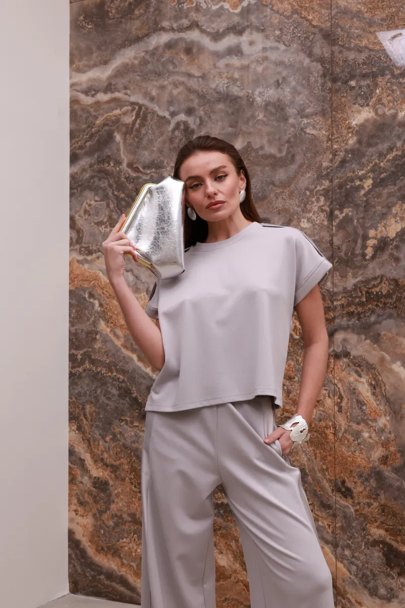 Лаконічна футболка IMPERIAL у благородному світло-сірому відтінку переосмислює базу завдяки сатиновим вставкам, які делікатно підкреслюють силует і додають образу вишуканого блиску.