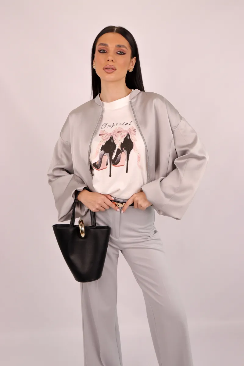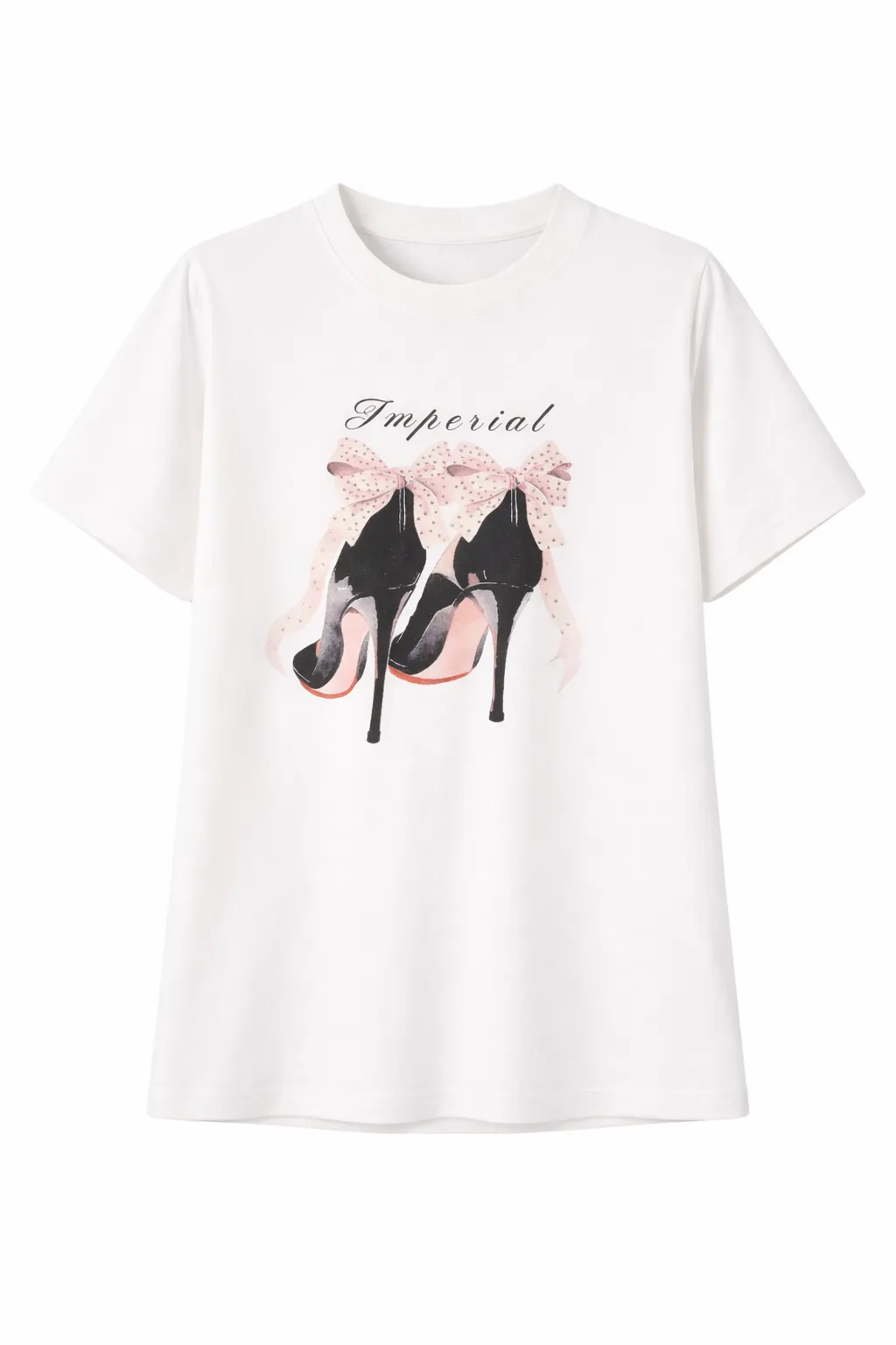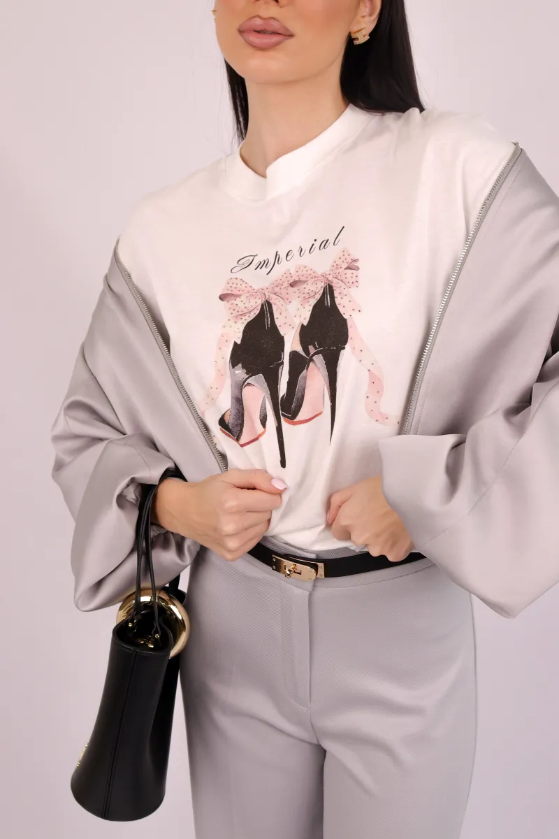 Стильна жіноча футболка світлого відтінку з витонченим принтом туфель на підборах IMPERIAL, що додає образу жіночності та елегантності.