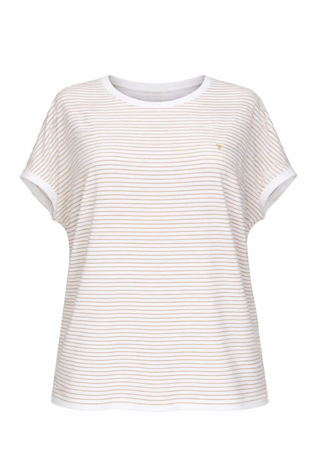 Стильна футболка в бежево-білу смужку — універсальна річ для повсякденного гардеробу.