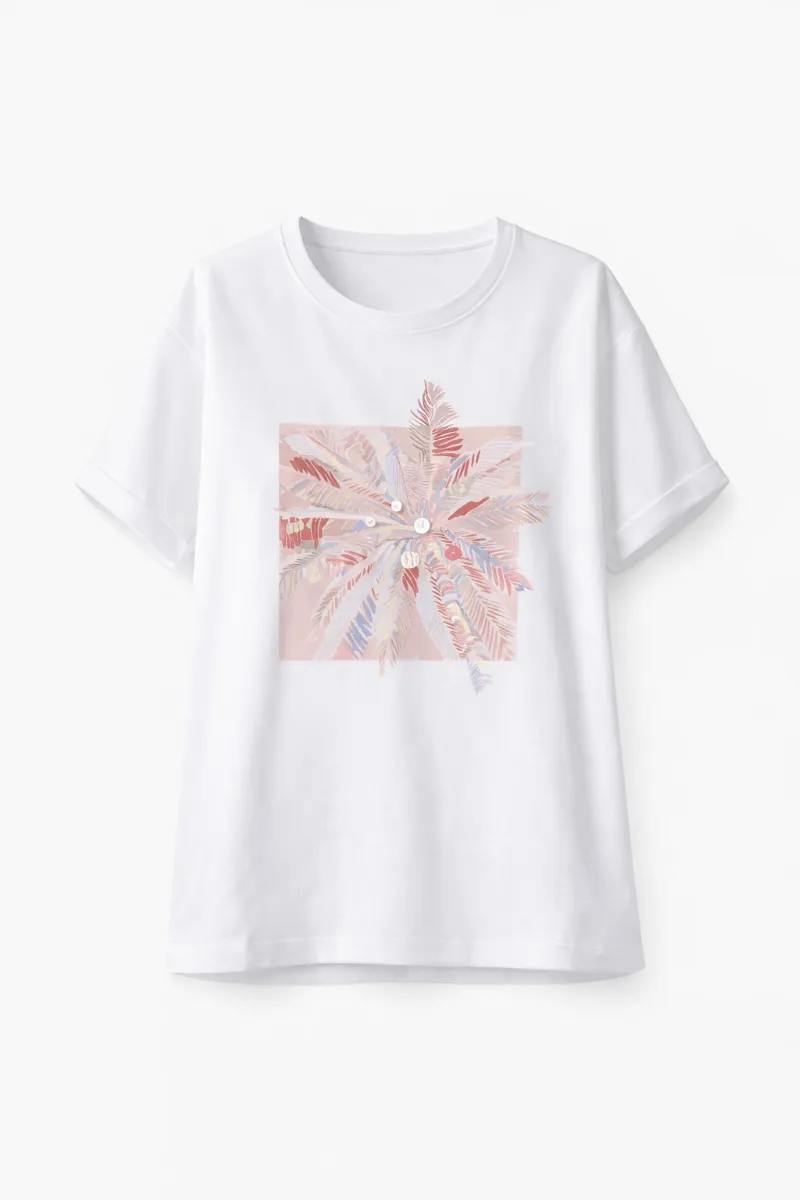 Легка біла футболка з витонченим принтом у пастельних відтінках — ідеальний варіант для ніжних та стильних образів.