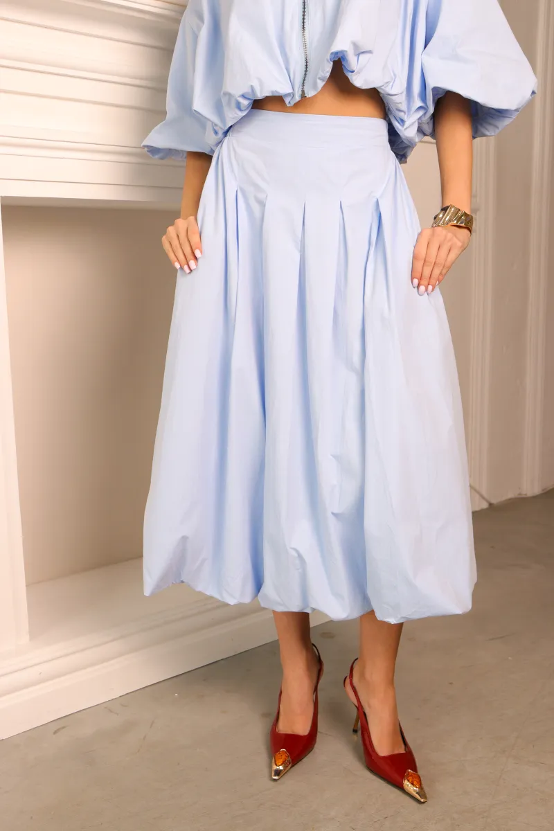 Сучасний котоновий костюм у ніжному блакитному відтінку, що складається з укороченого бомбера на блискавці та спідниці міді.