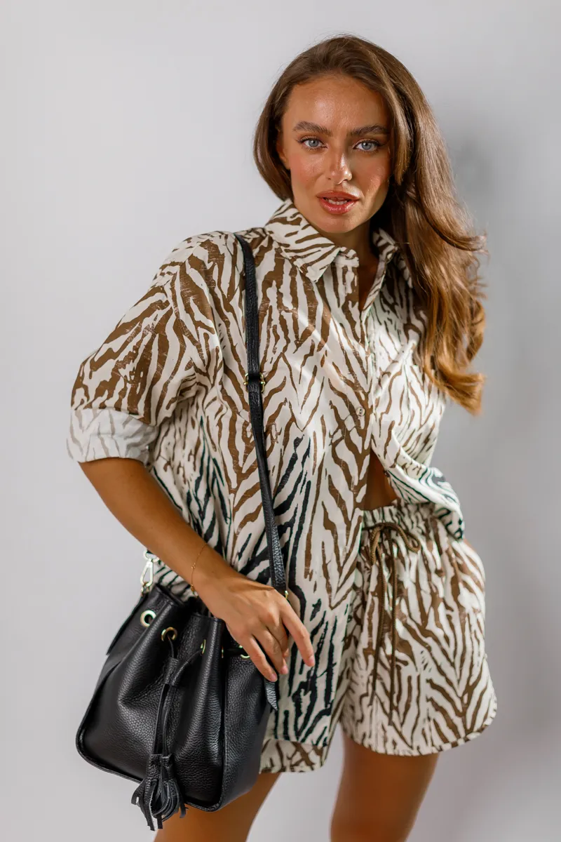 Принт зебри у коричневих, бежевих та чорних відтінках додає образу унікальності та елегантності.