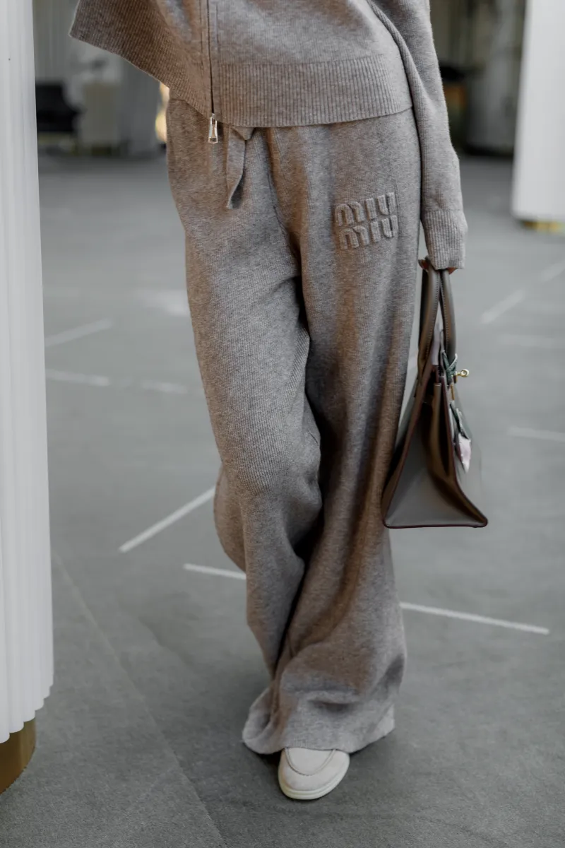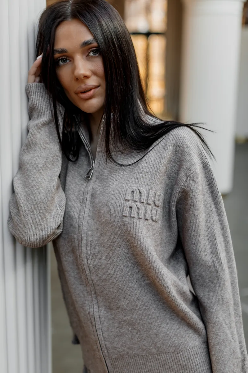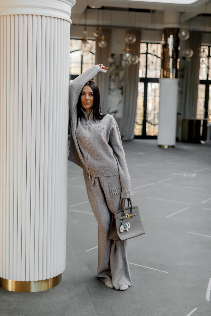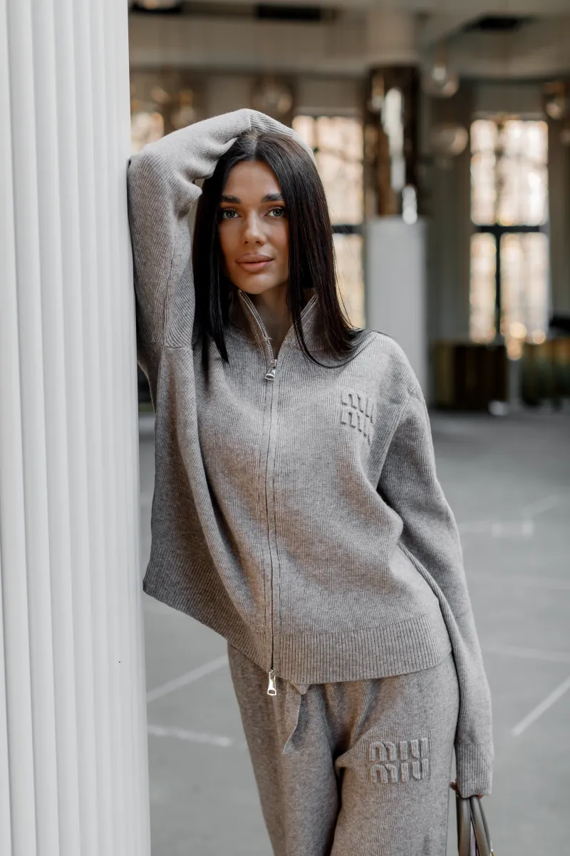 В'язаний костюм із м'якої пряжі у модному бежевому відтінку. Джемпер на блискавці з високим коміром, оздоблений лаконічною текстурною вишивкою в тон. Штани злегка розкльошені від коліна, з комфортною посадкою.