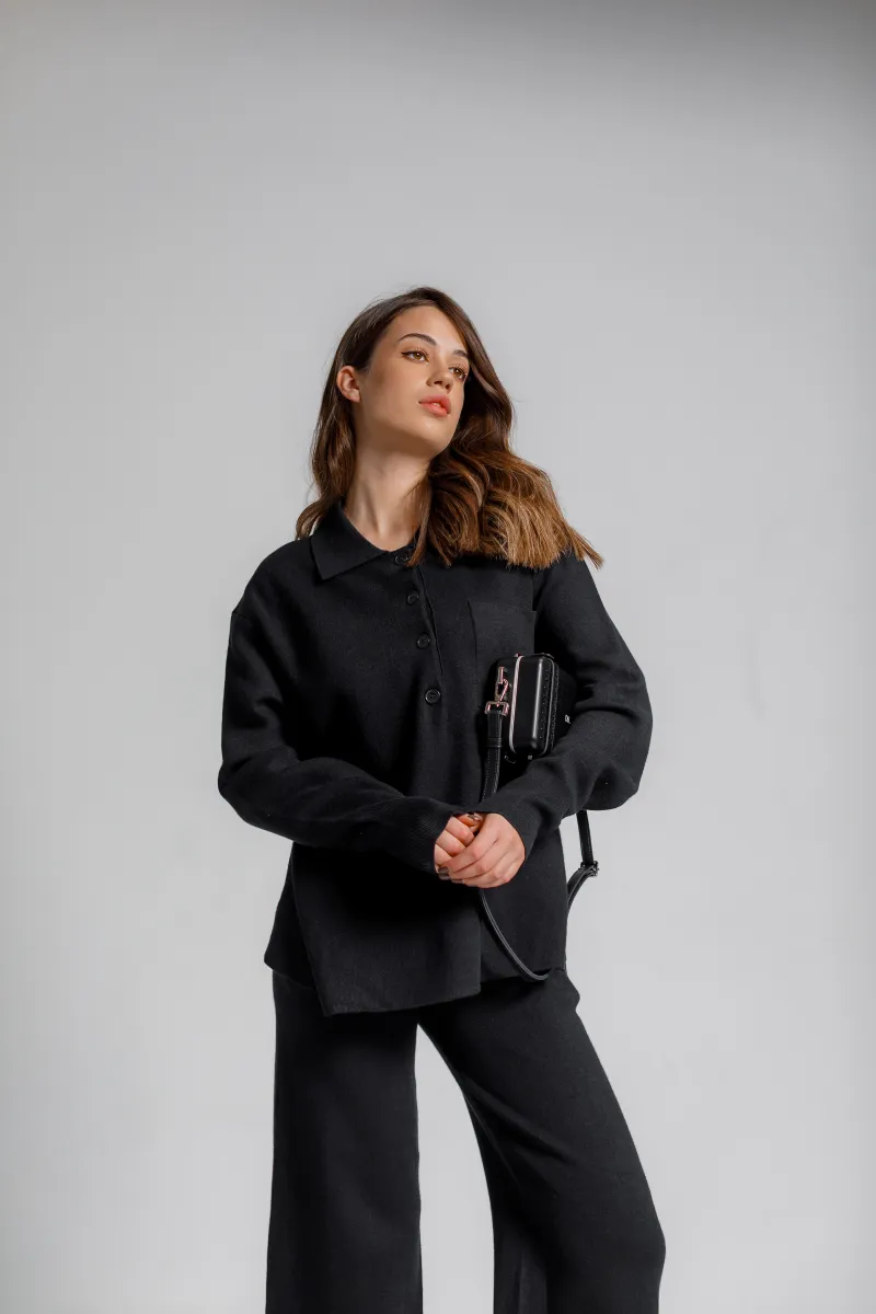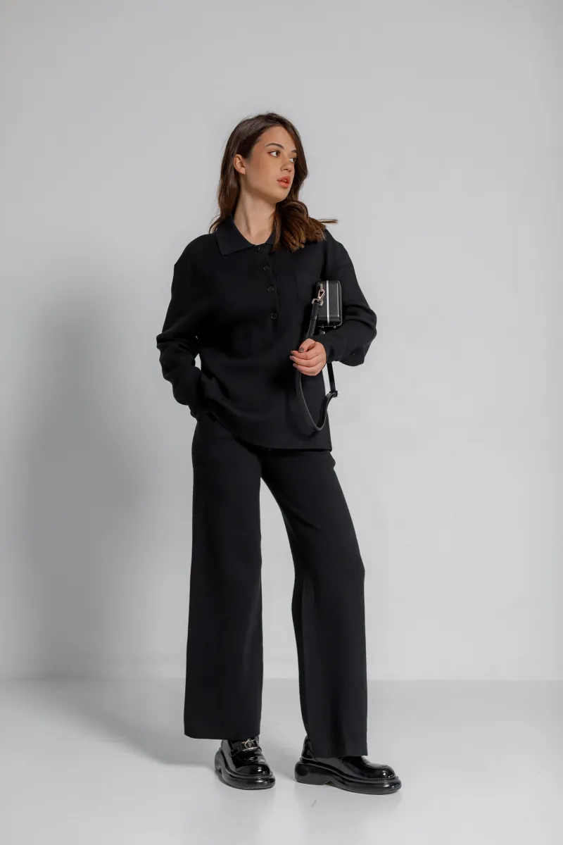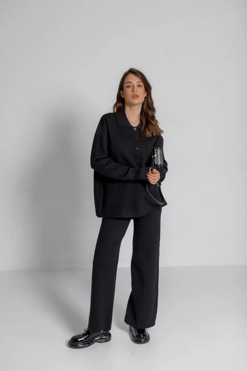 Вишуканий трикотажний костюм-двійка у класичному чорному кольорі — ідеальне рішення для сучасної жінки, що цінує комфорт і стиль. Верх — вільна кофта з довгим рукавом, коміром-стійкою та застібкою на гудзики. Штани прямого крою з елегантною посадкою додають силуету витонченості.