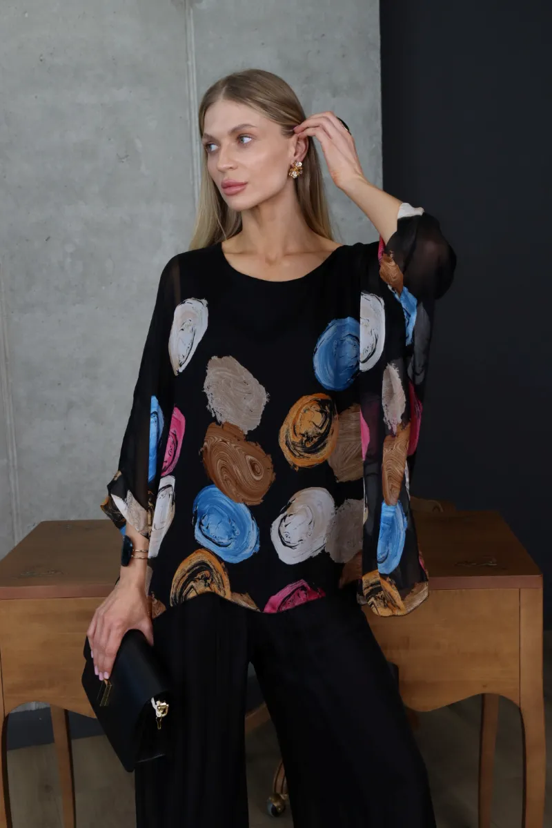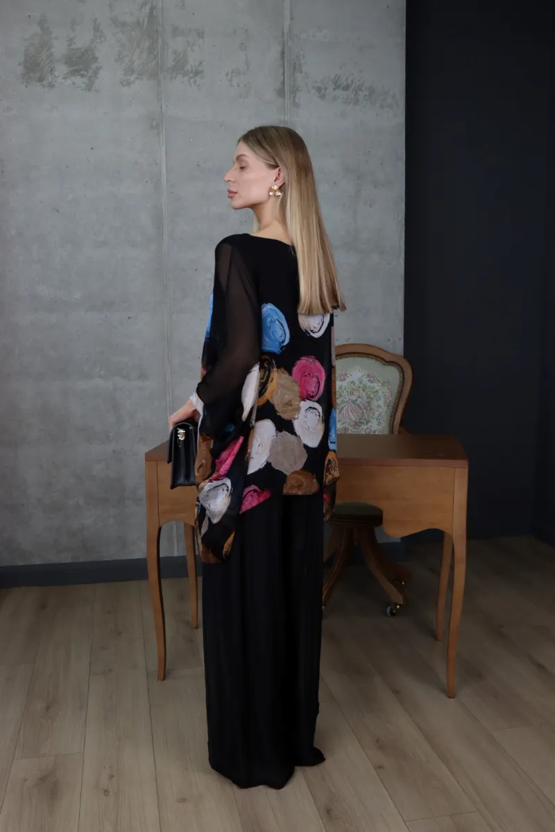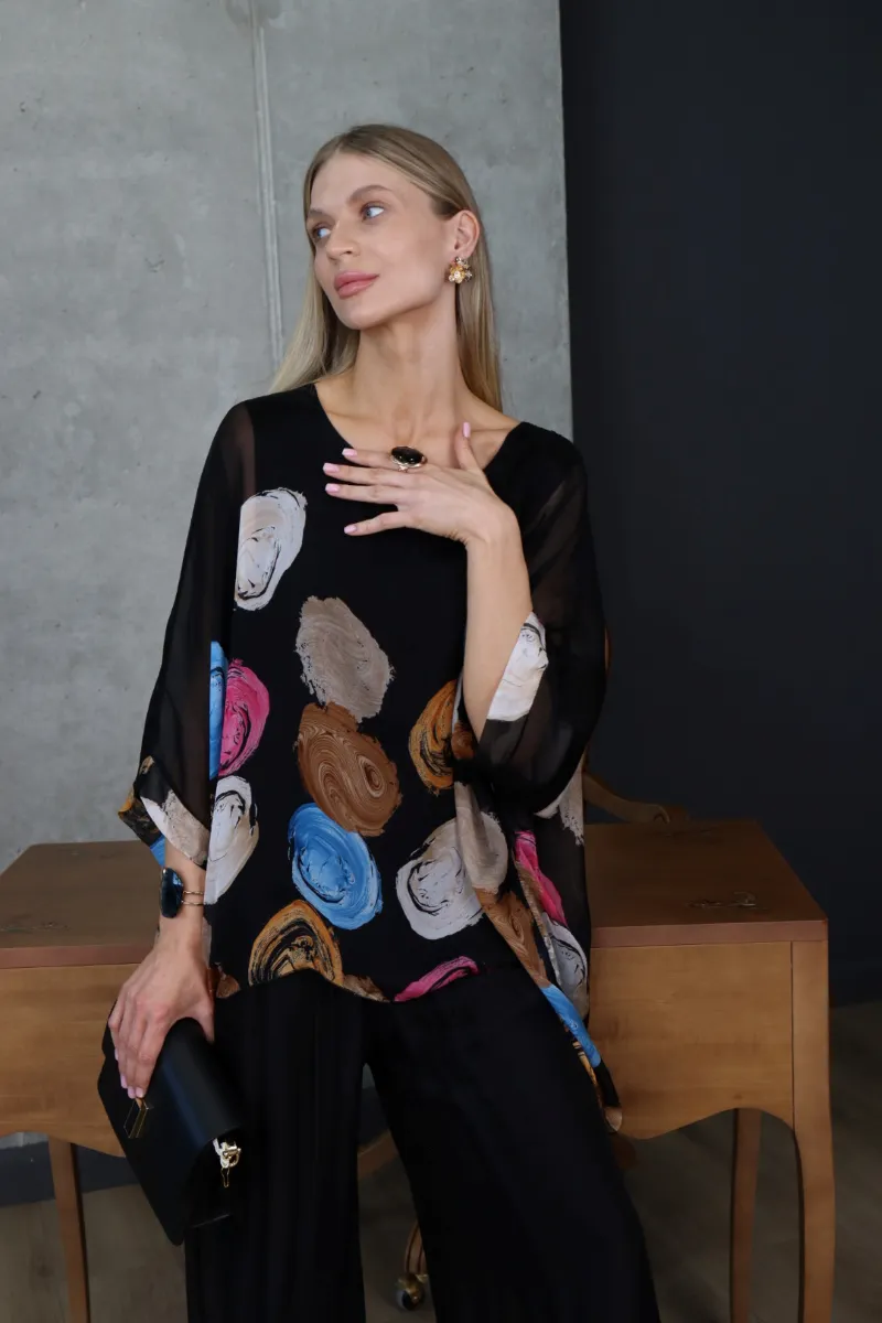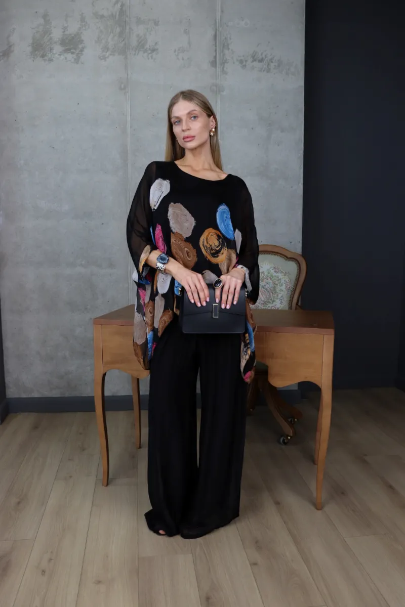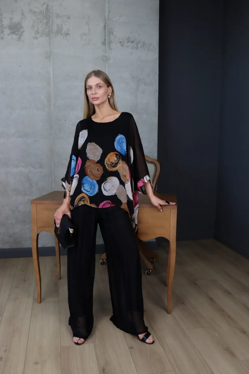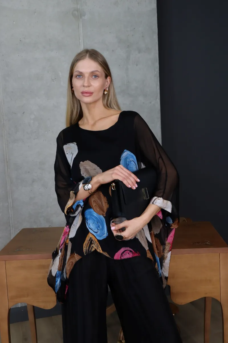 Комплект складається з вільної блузи з художнім принтом та широких штанів, що створюють стильний і гармонійний силует.