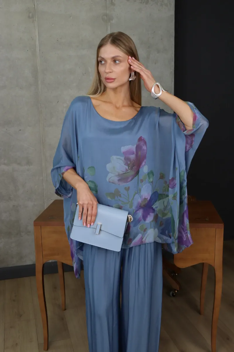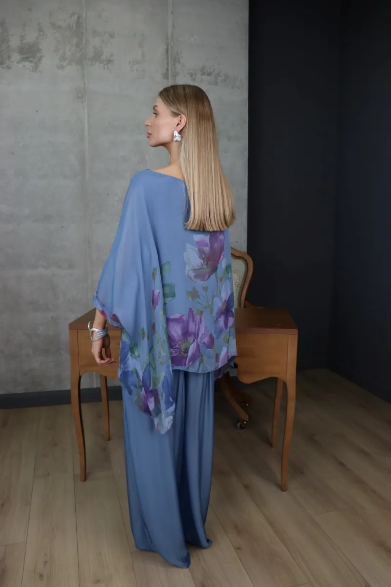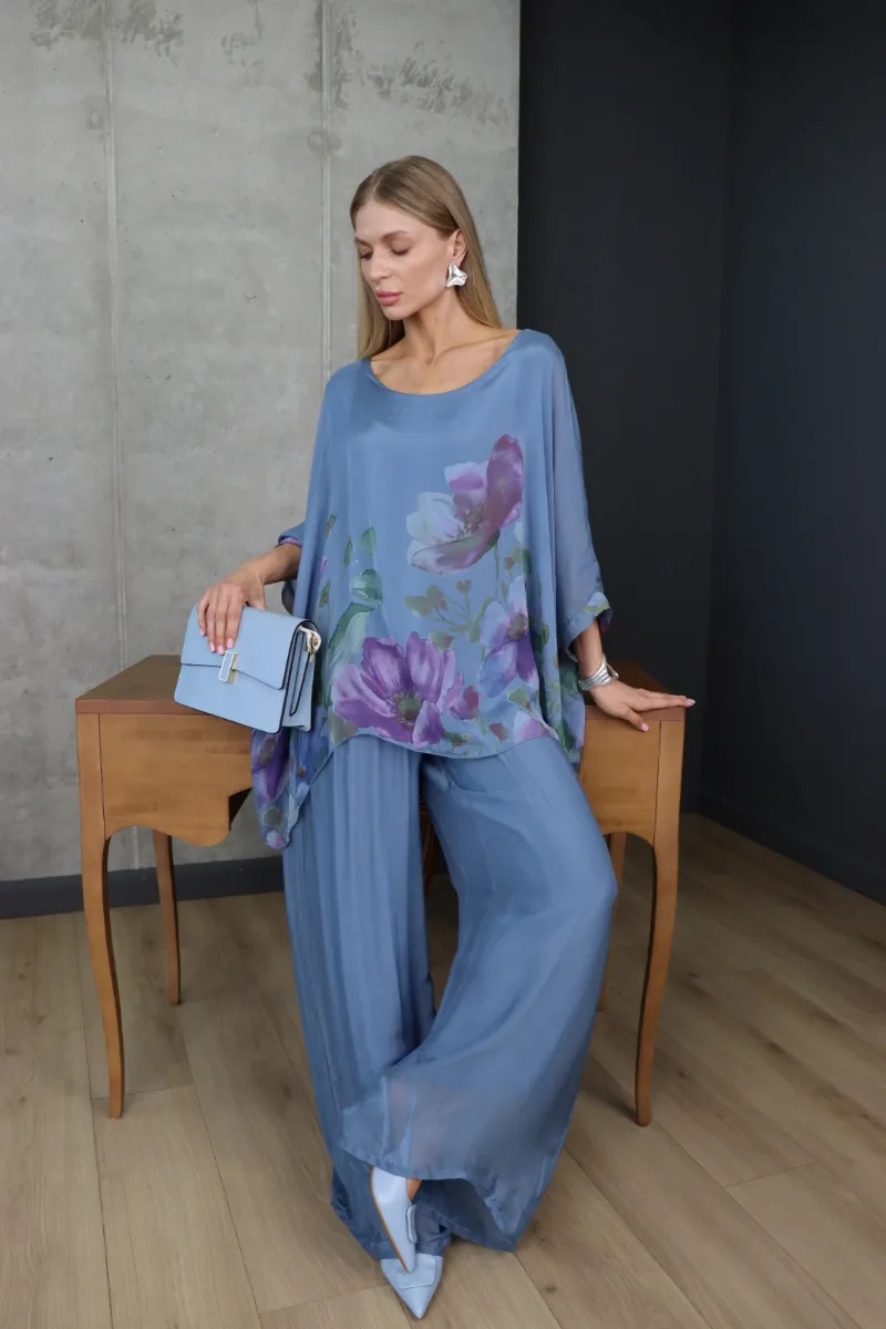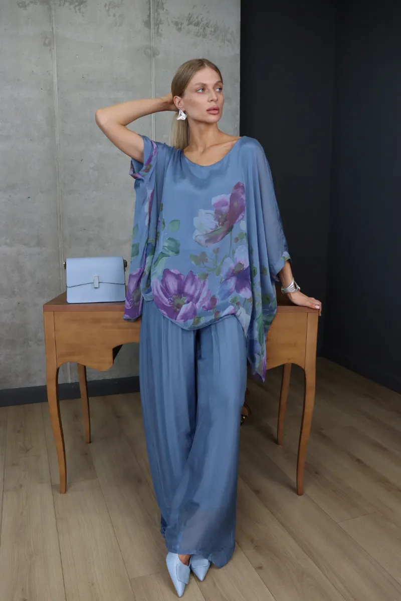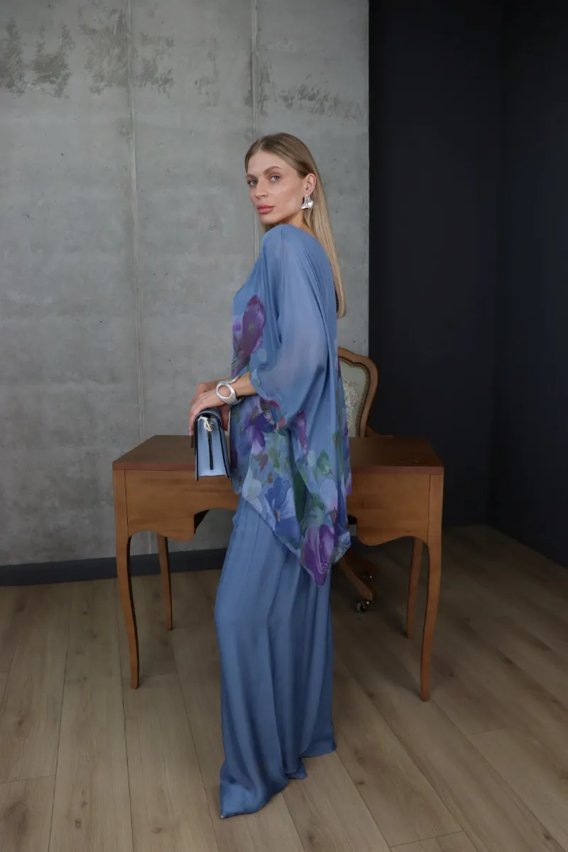 Комплект складається з вільної блузи з квітковим принтом та широких штанів, що створюють витончений і гармонійний силует.