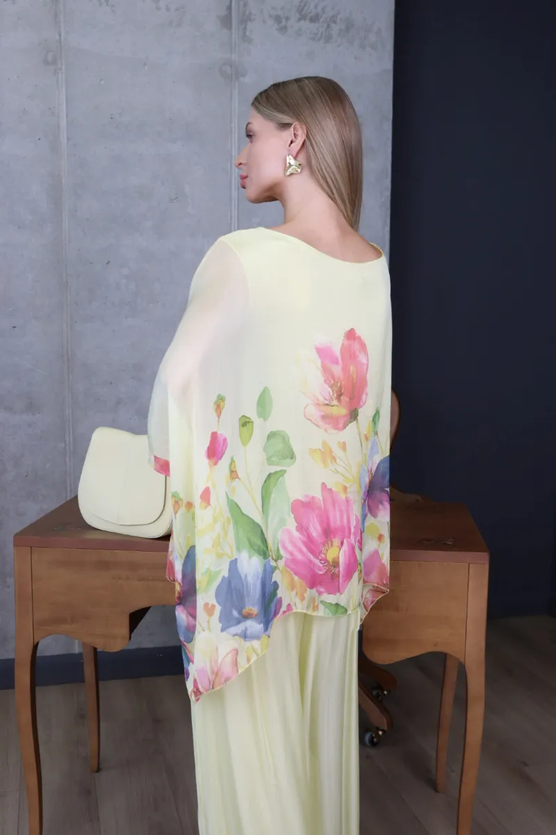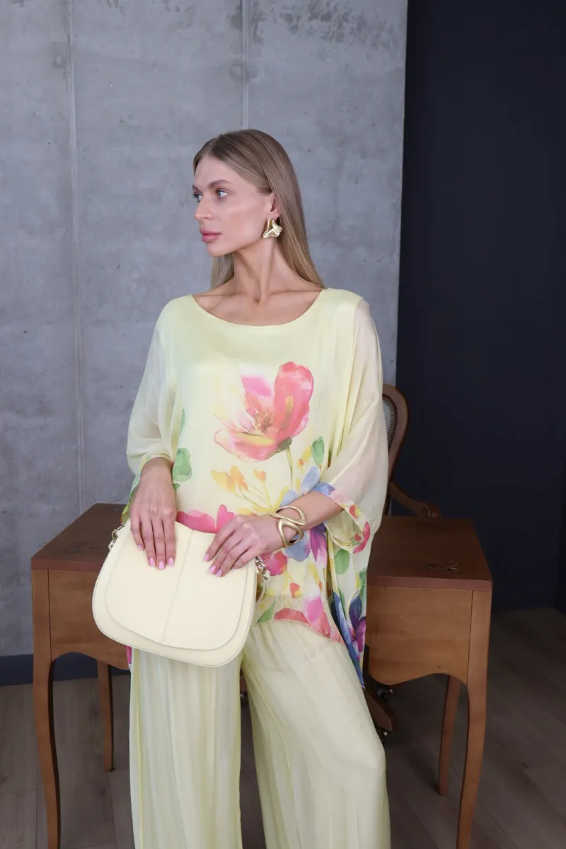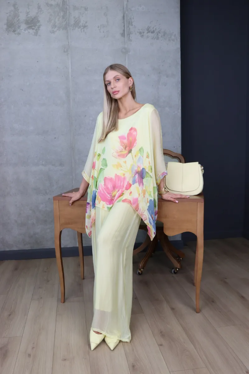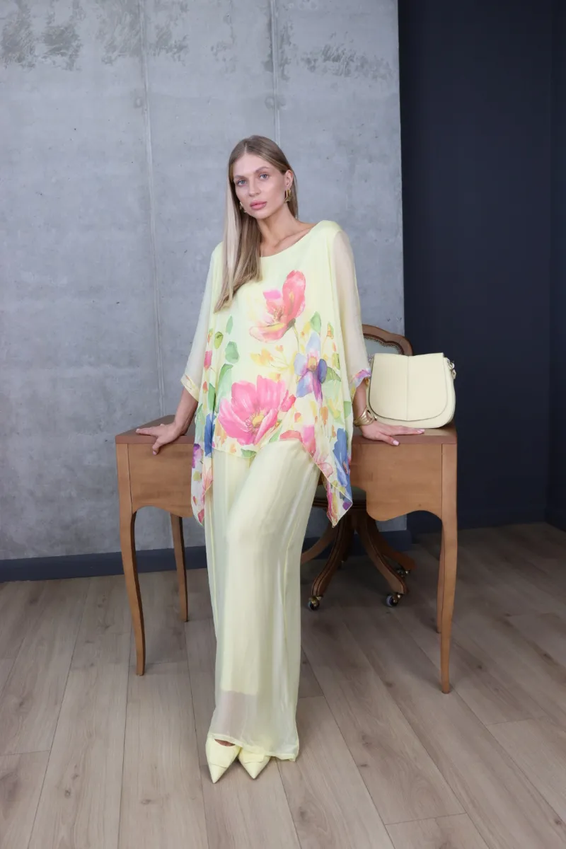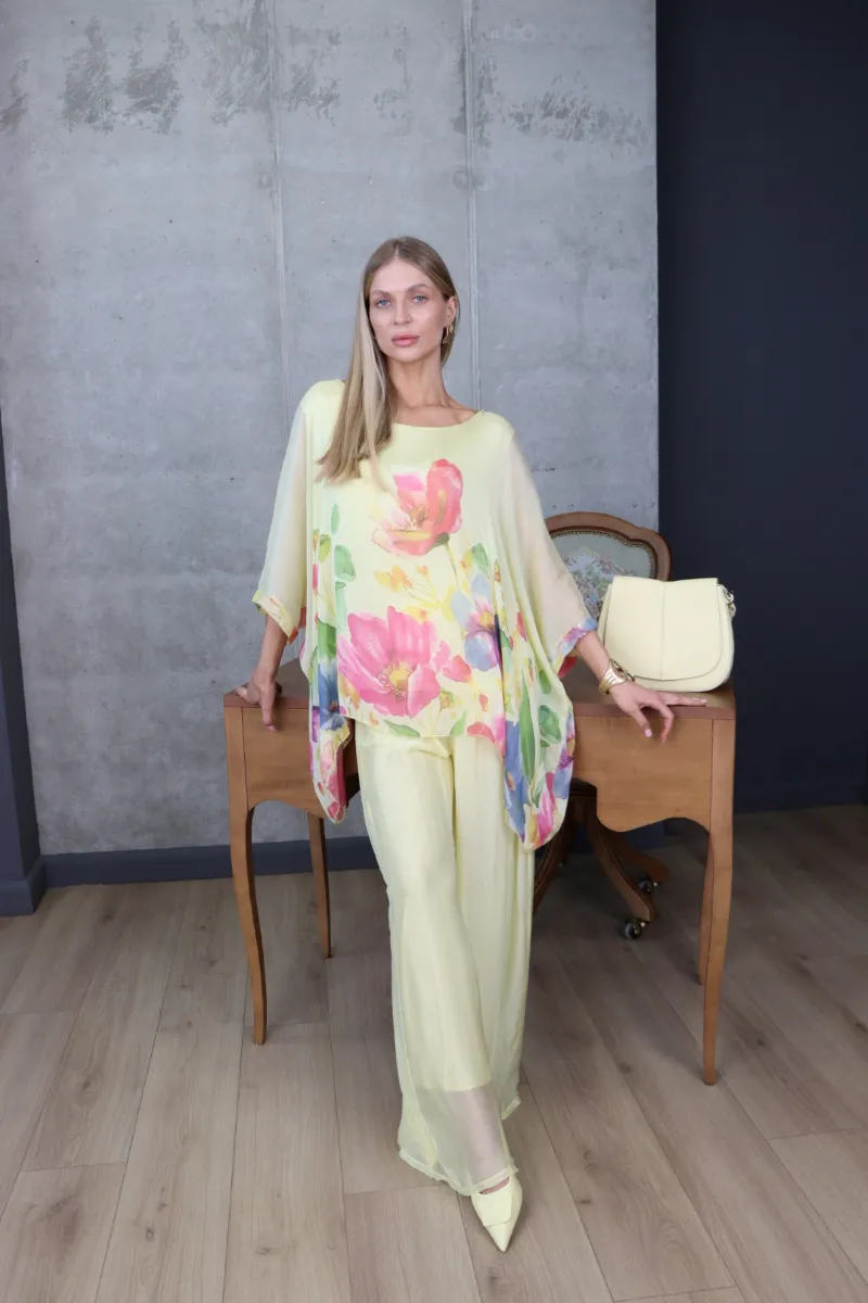 Комплект складається з вільної блузи з яскравим квітковим принтом та широких штанів, що створюють витончений і гармонійний силует.