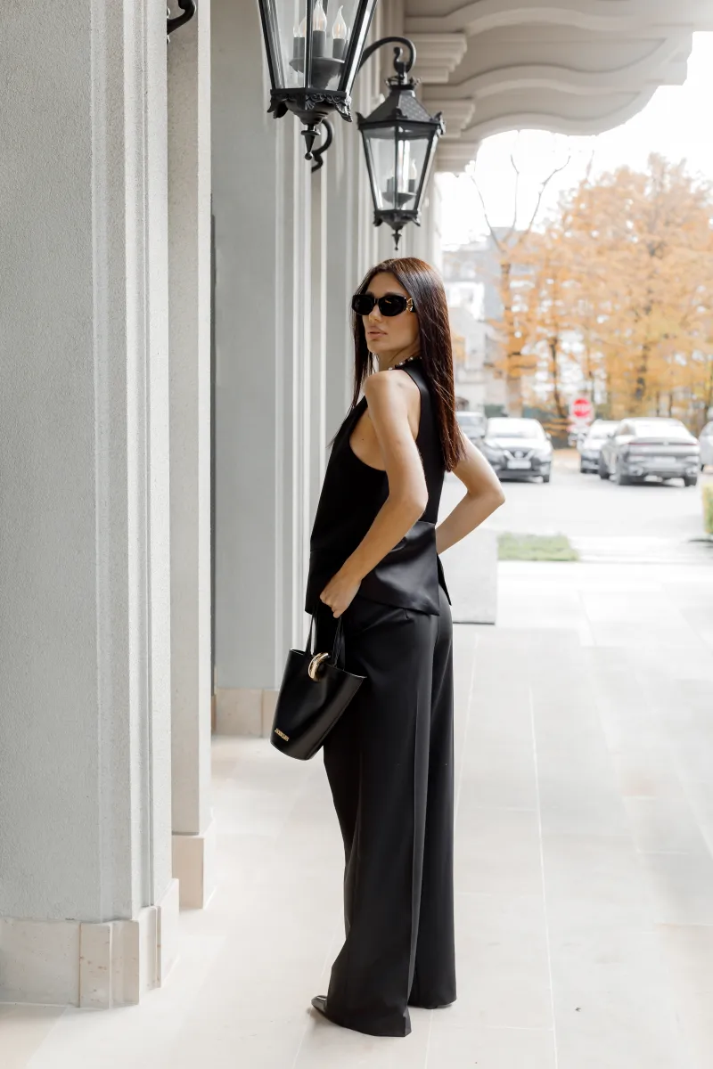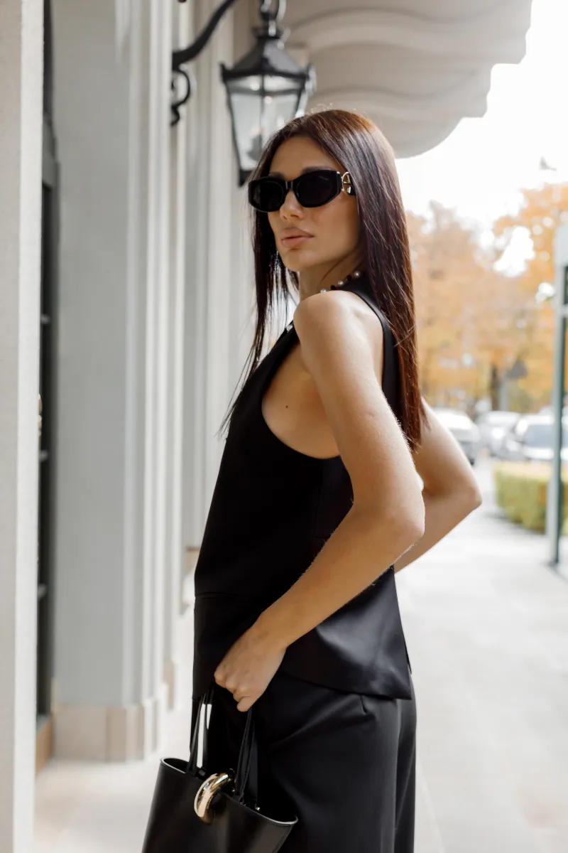 Жіночий чорний топ у вигляді жилета — стильна альтернатива класичним блузам. Модель без рукавів з витонченим коміром та декоративною краваткою спереду. Застібається на два ґудзики, має прорізні кишені, що додають практичності. Підійде як для ділових образів, так і для вечірніх виходів.