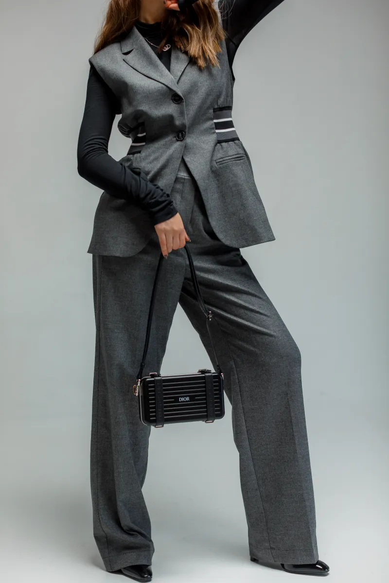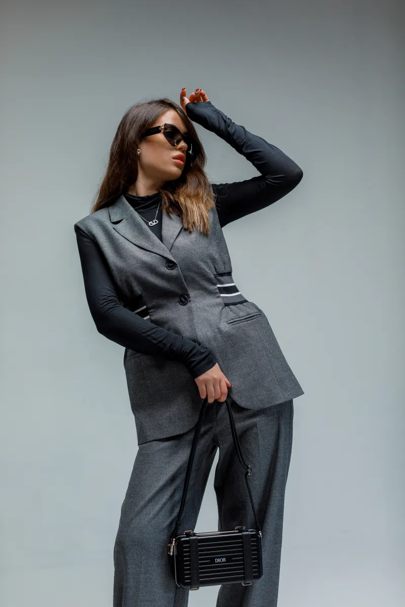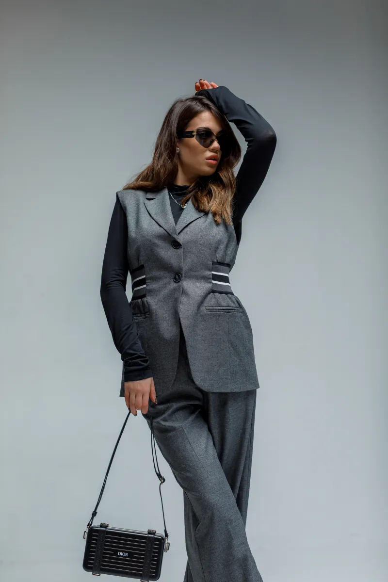 Жилет з однобортною застібкою на два ґудзики та контрастними боковими смужками, що підкреслюють талію. Передні прорізні кишені забезпечують функціональну елегантність. Цей виріб пропонує універсальне рішення для багатошарового носіння, додаючи сучасного характеру вишуканим, індивідуальним ансамблям.
