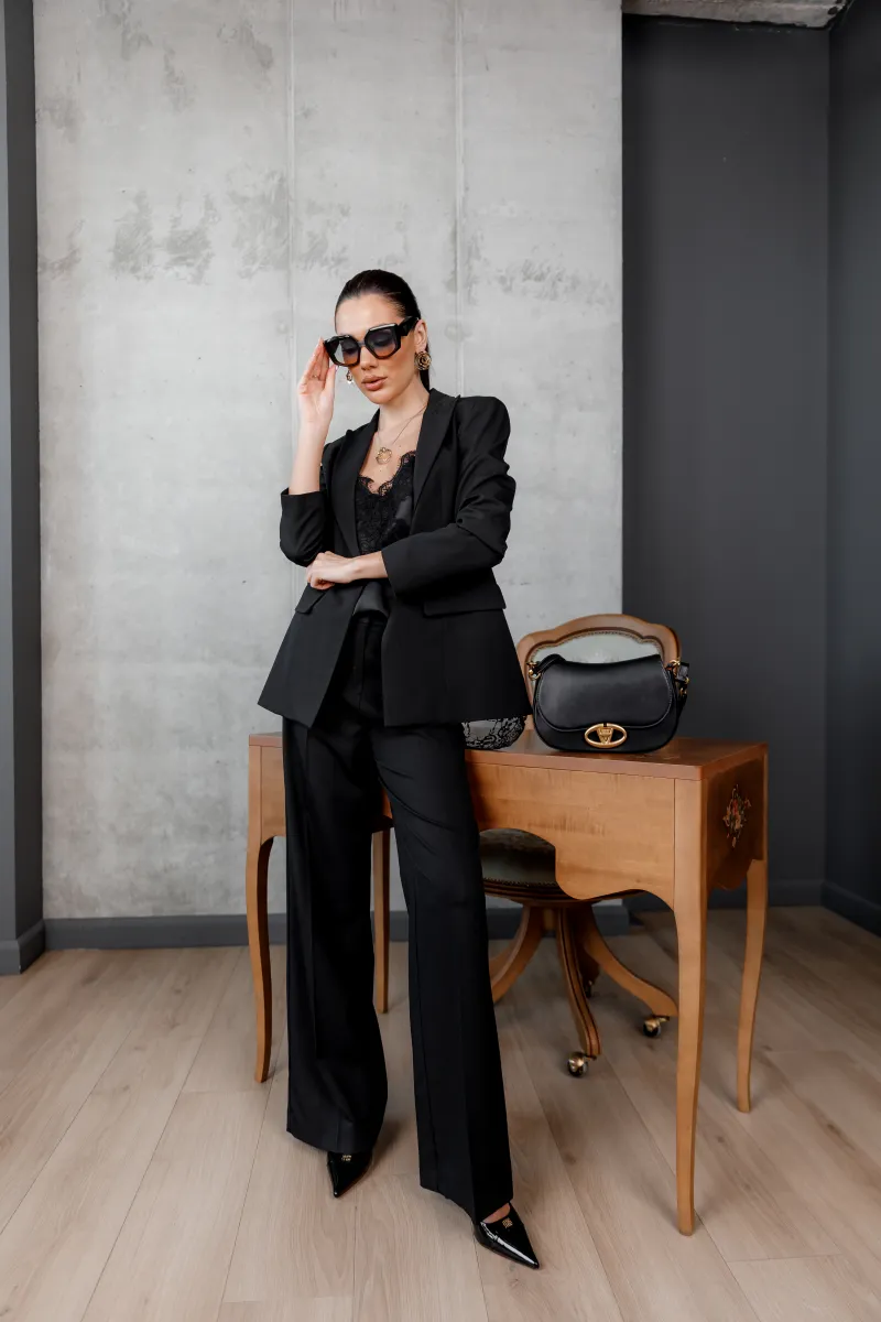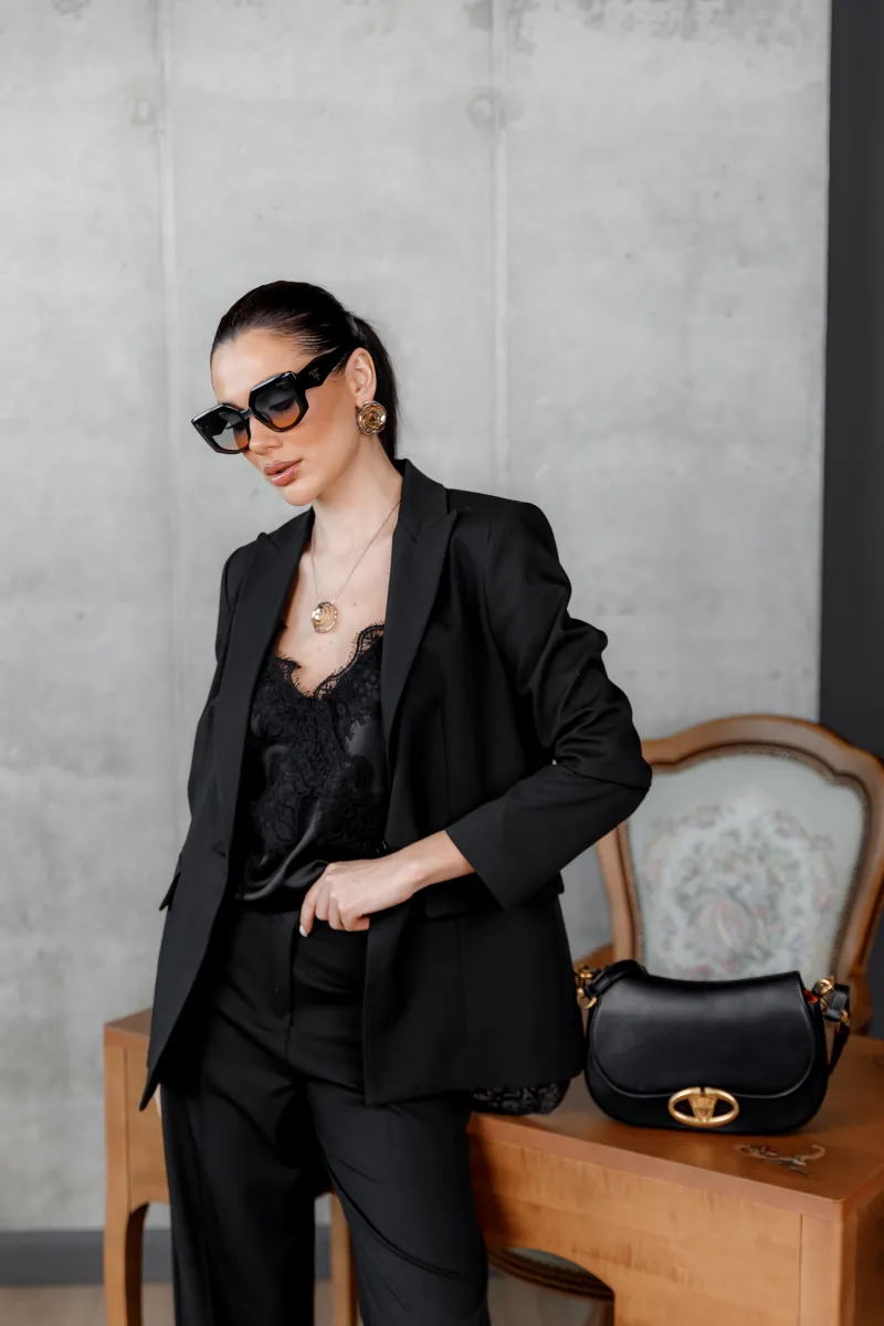 Піджак ідеально поєднується з штанами у комплекті, а також гармонійно доповнює вечірні образи з топами або мереживними блузами