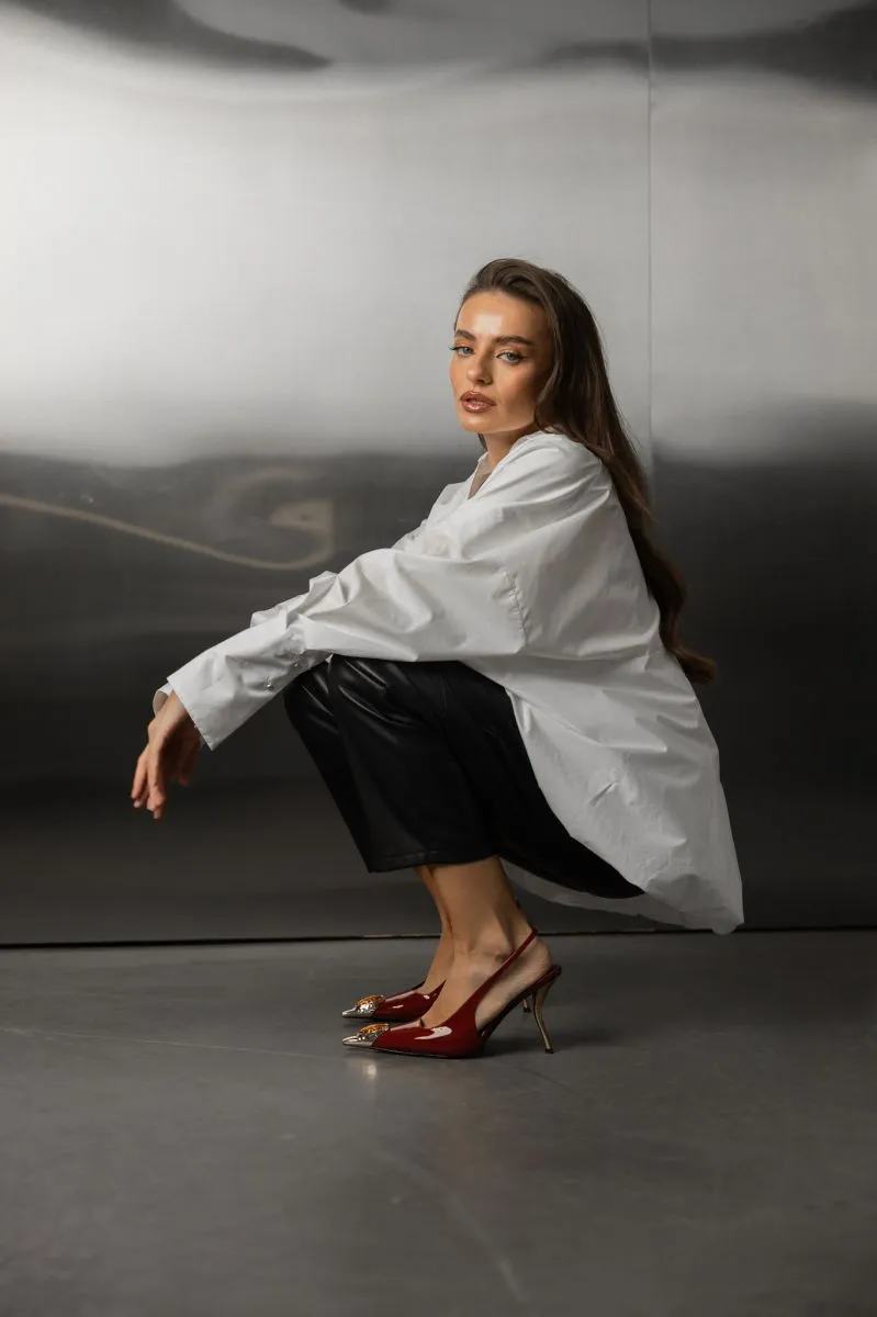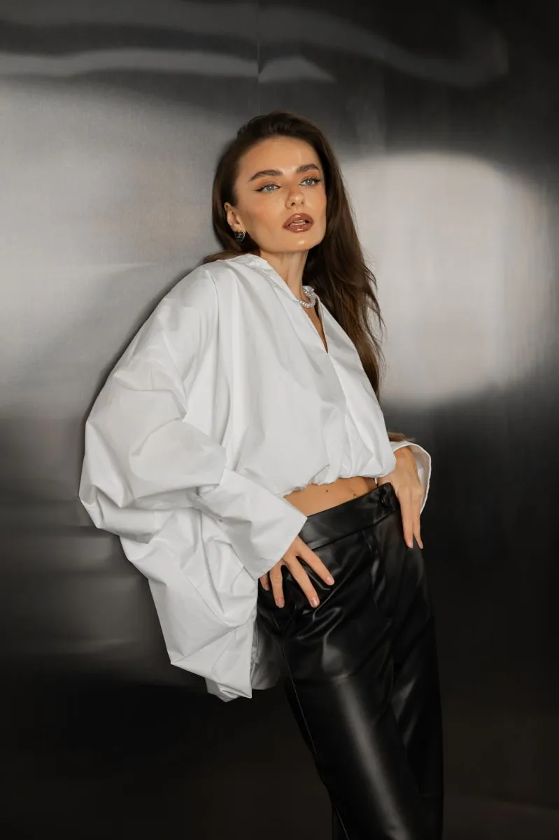 Ця біла сорочка — базовий елемент гардероба, який поєднує в собі елегантність і комфорт. Вільний фасон, подовжені рукави та глибокий виріз формують сучасний образ, що підходить як для повсякденного стилю, так і для офісу чи виходу. Сорочка красиво лягає на фігуру та легко комбінується з будь-яким низом — джинсами, спідницями чи штанами з екошкіри.