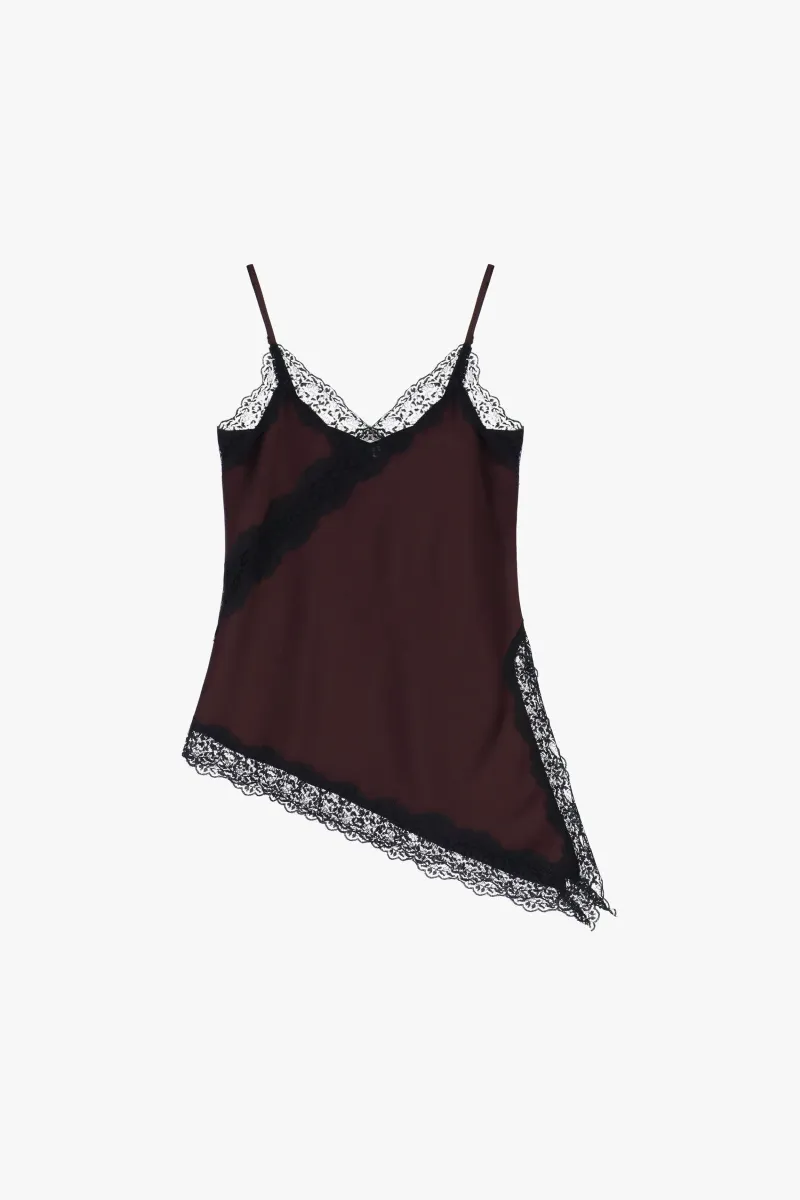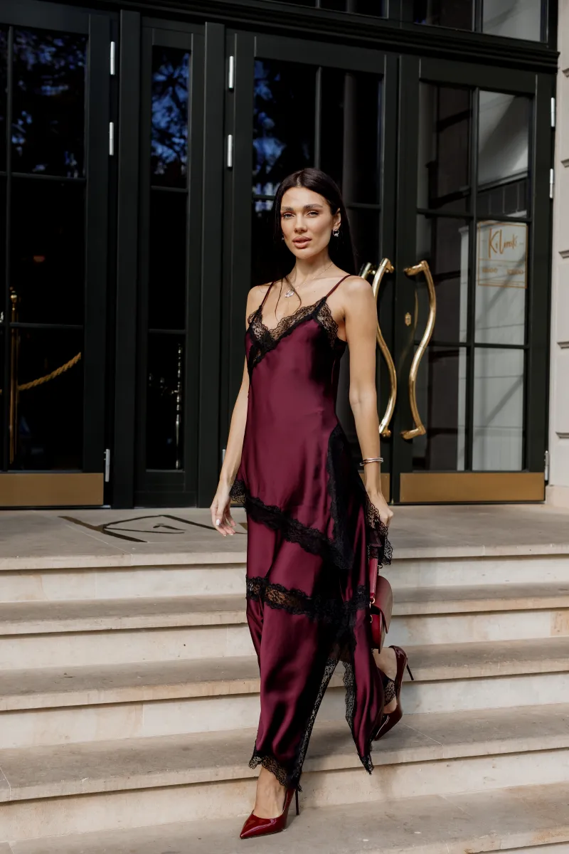 Цей бордовий топ із сатину вирізняється легким блиском, асиметричним кроєм та тонкими бретелями, які додають образу витонченості. Контрастне мереживо акцентує лінії декольте та нижній край виробу. Ідеальний вибір для вечірнього виходу або стильного повсякденного луку.