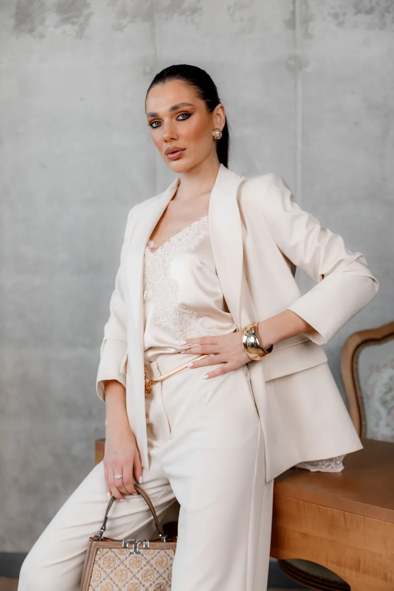 Тонкі бретелі підкреслюють делікатність силуету, а універсальний крій дозволяє поєднувати топ як із класичними жакетами, так і з повсякденними образами.